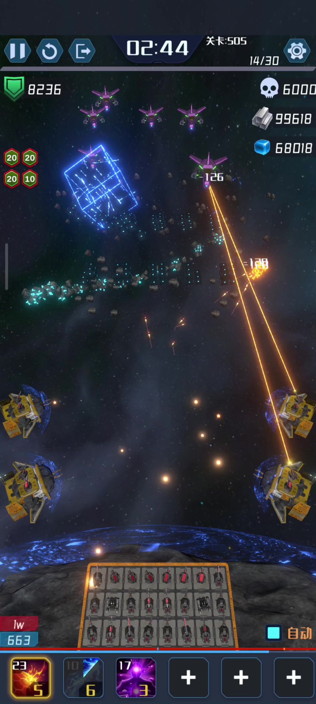 注意一下几点 0,长摁屏幕可以蓄力射击 1,⚡闪电图标是飞船加速(优先拿,避免被炮弹追上),🧲磁铁图标是扩大拾取范围(优先),雷达图标是探索范围(前面晶石有余顺便拿) 2,有速射炮尽量拿速射炮 3,下面图标都拿完以后探索遗迹里面的小金豆 4,右上角宝箱显示190就可以找传送门撤退了 5,优先探索左下角,(噩梦)最后3分钟Boss从左下角出现,不好打还不给东西可以忽略 其他需要注意暂时没想到,欢迎大