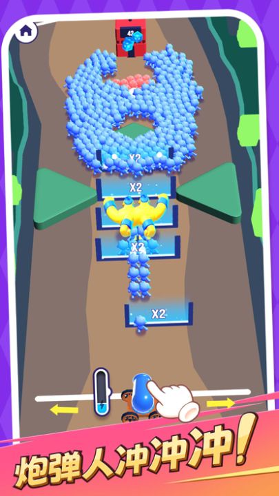 每个玩家都可以利用大炮等武器喷射大量的士兵,并带领这些士兵进攻敌人获取胜利。但这不仅是一场简单的军事行动,而是一次真正意义上的挑战:行军路线中会出现各种不同形式并且会变换的倍增门,帮助玩家增加士兵,并且也会有一些障碍物消耗士兵,迫使玩家随时作出明智的决策,才能保持领先优势。
