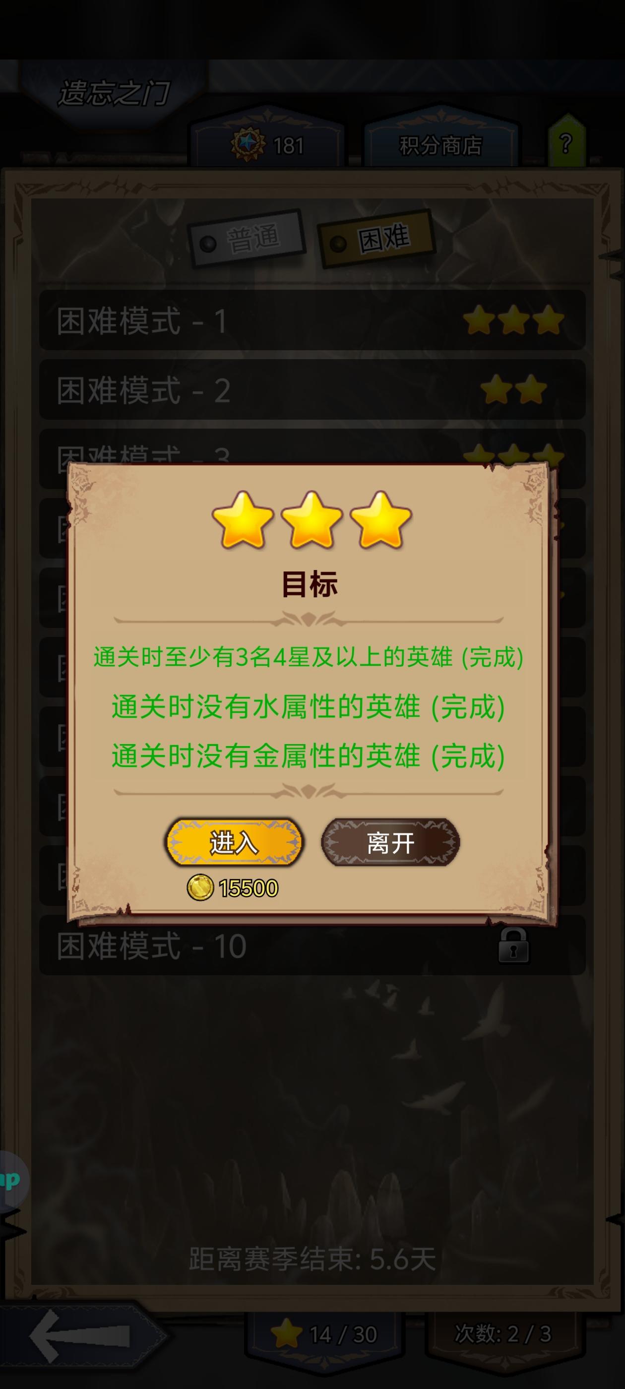众所周知,越到后面越难打,这期难度也是比上次更难打。 困难4,禁水禁金,3个四星以上,这关没啥难度灵媒就能过。 困难5,单稀有,单属性。这个难度还是比较高的,想一次性三星比较困难。我这边是用武士+守护骑士+医生过去的,boss小怪伤害比较高,很吃装备。这边建议武士和守护有特质再来打。 困难6,这里我第一关小怪都打不过去了,因为我武士和猎魔都没特质,这里我建议是3英雄开局,打过2个boss后再买个,