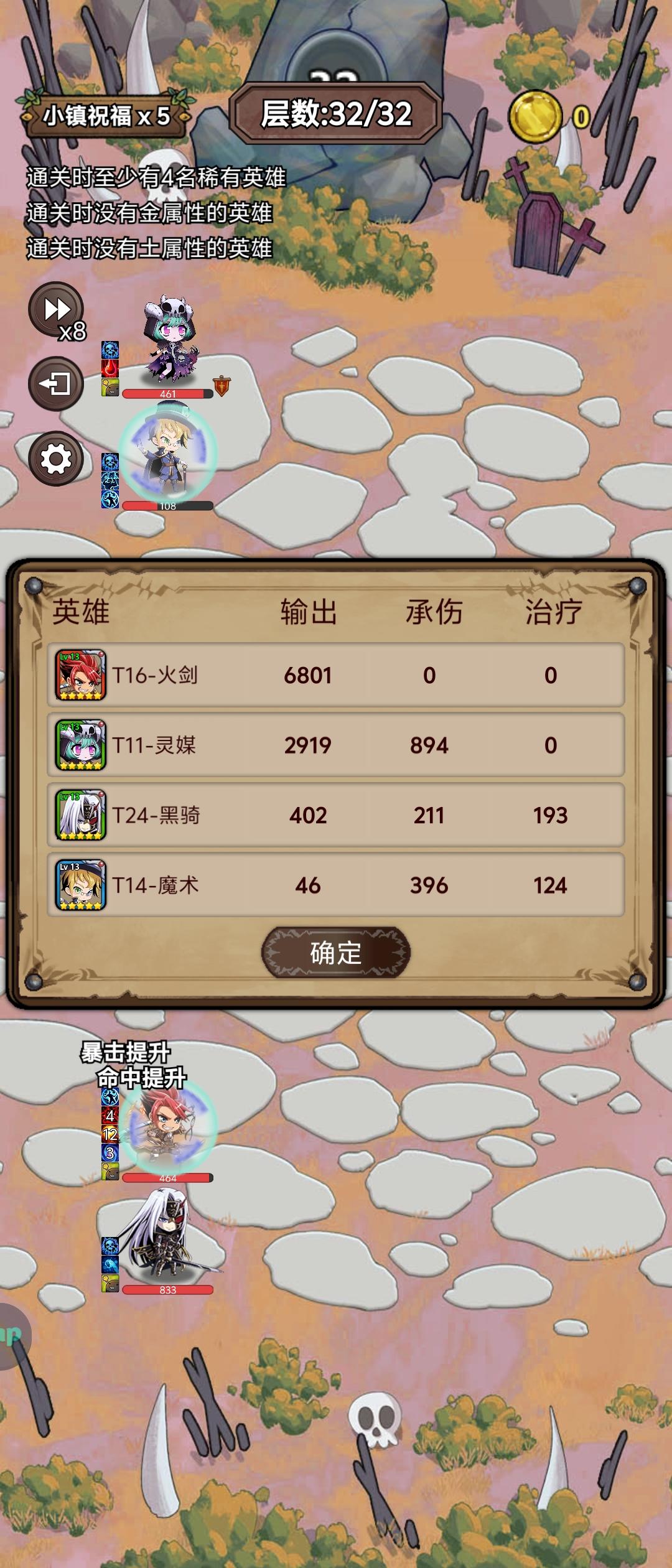 (普通)说说打法,前面找到灵媒/猎人作为主力输出,然后再找到医生作为第二个boss对策。然后2个人可以一直挂机到第二个boss。中间可以拿一些装备。 到最终boss无面人前面,需要一定的金币,卖掉所有角色,找到猎魔人、神官,两个都拉到四星,我是有反击刀,然后猎魔人天赋洗了持续伤害+1回合的天赋。神官技能随便boss复制,无所谓的。感觉其实猎魔人单打会更好。我准备了12个药,反正半血就补一下,防御够