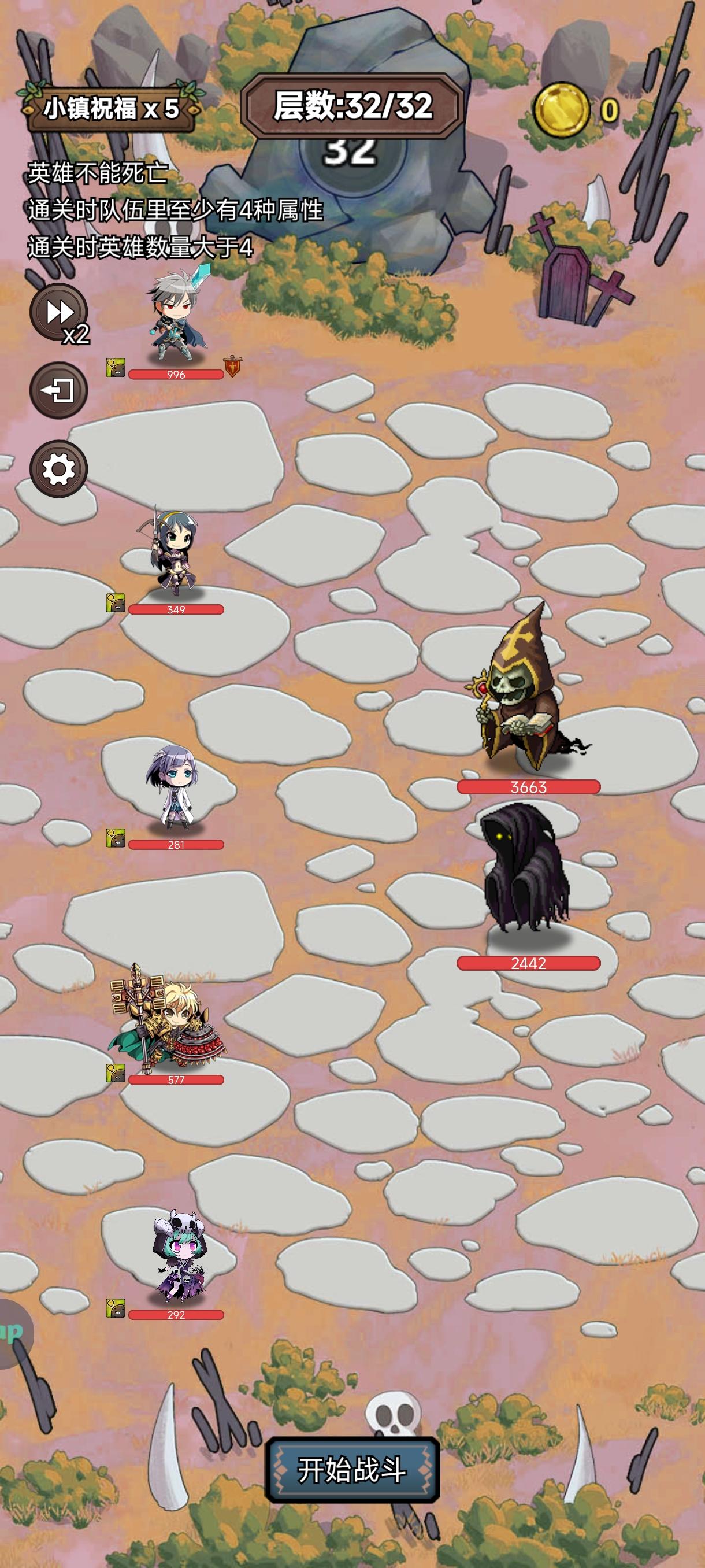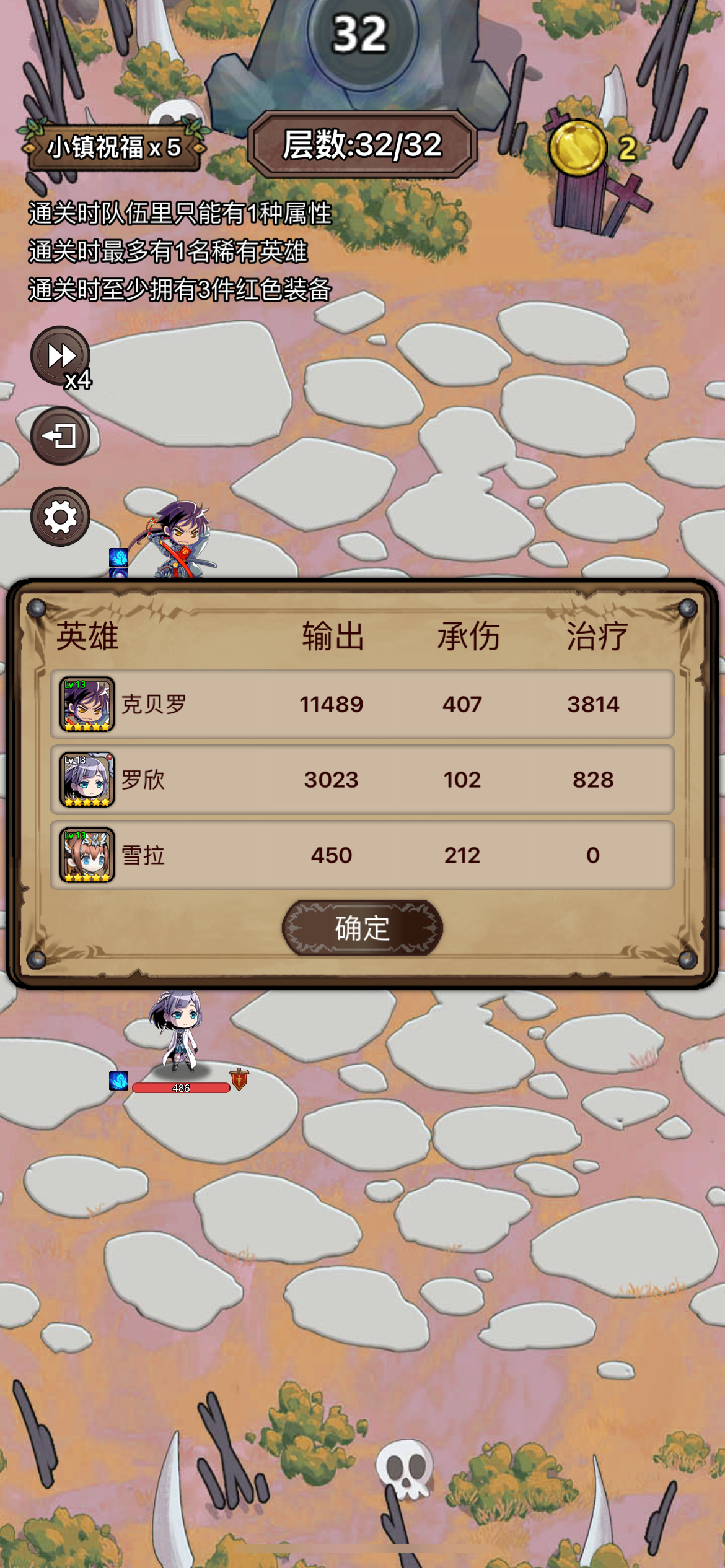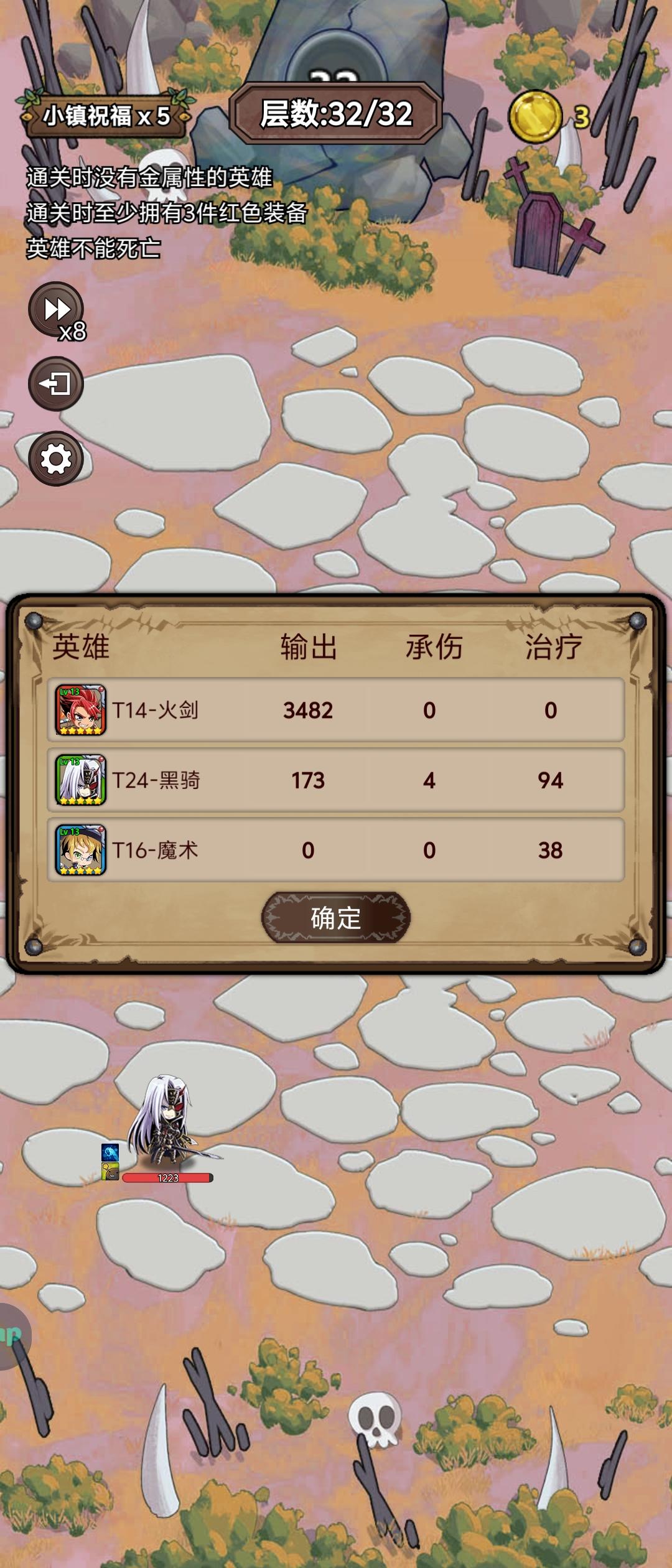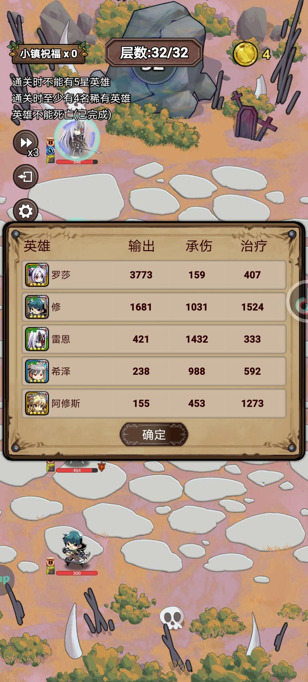 有点难度的王,最麻烦的是凑4属性的单稀有,浪费好多钱去刷英雄,最后实在没办法买了个土骑,装备一般,最主要的还是冰法的5星专武,相信大部分人多打几次还是能过的,新手不要强求一次通关