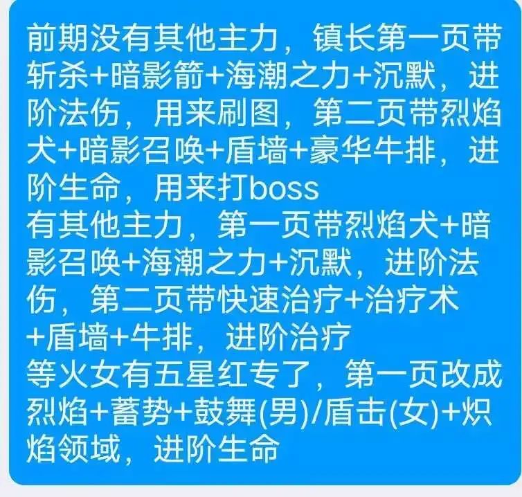 2025.2.8更新 目前分2个流派,火队和水队 火队(以烈焰法师、长戟为核心 大后期单长戟单C速刷))、水队(以光剑士、魔法剑士为核心) 1.火队升星推荐 女/男镇长皆可,女镇长适配度比较高 灵媒 圣骑 火女(需要5星专武才有质变若无顺延下一个) 医生 长戟(尽量白嫖) 魔术 黑骑 佣兵/狙击/火箭 2,水队升星推荐 男/女镇长皆可男镇长适配度比较高 灵媒 光剑3星(先3星开4技能,魔剑5星后补