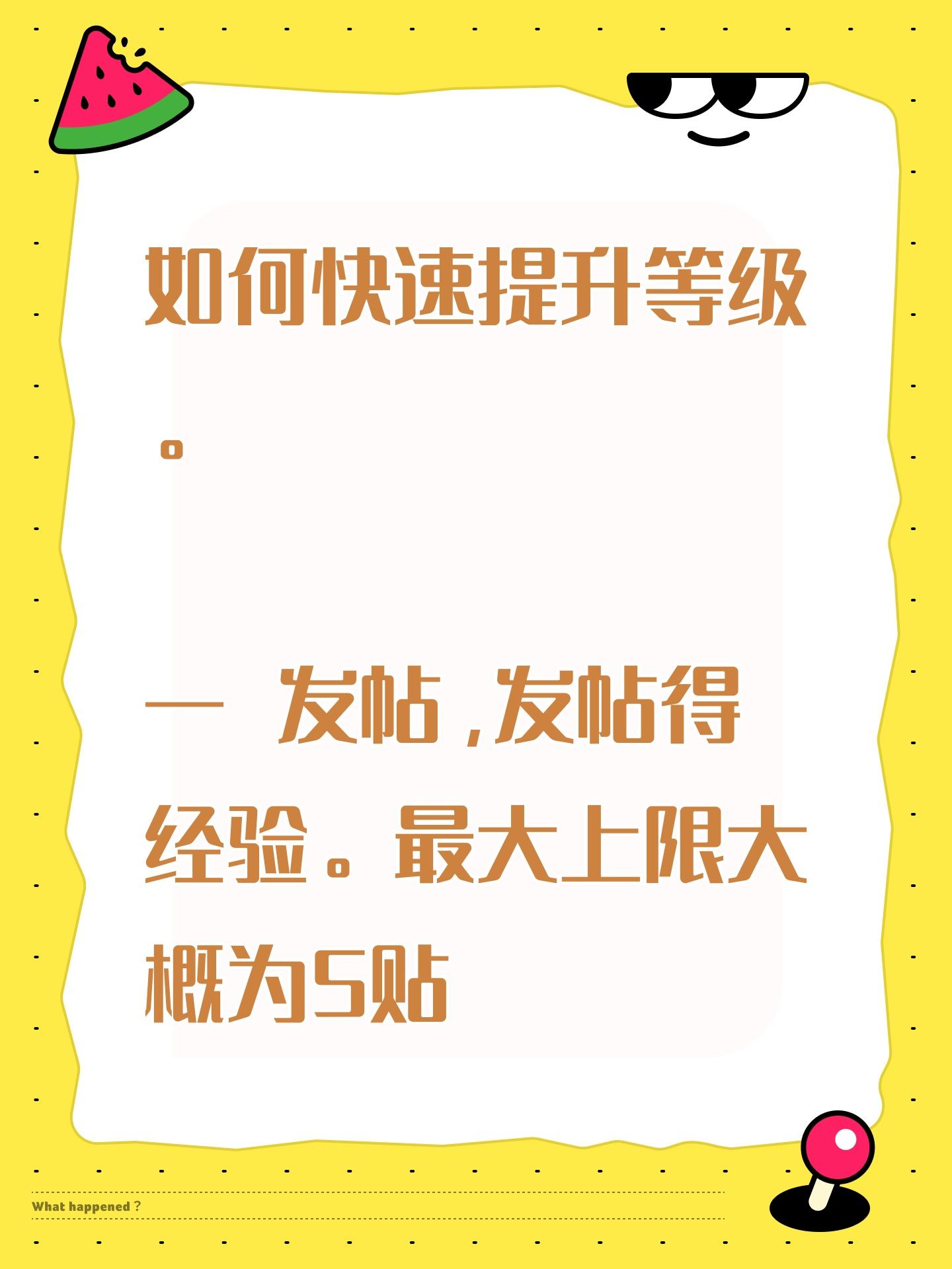 如何快速提升等级。 一 发帖,发帖得经验。最大上限大概为5贴 二 回复与被回复。二者都可以得到相应的经验。被回复的经验要高,预计上限为十条回复 三 点赞与被点赞。同理,被点赞经验更高,上限待测 四 加精。直接经验30啊!但是对人的理论水平和游戏了解程度有一定要求。 五 举报。举报上限为3,经验应该大于或等于5。只有举报成功(即得到管理员回复认可)才有经验。 诚信互赞。