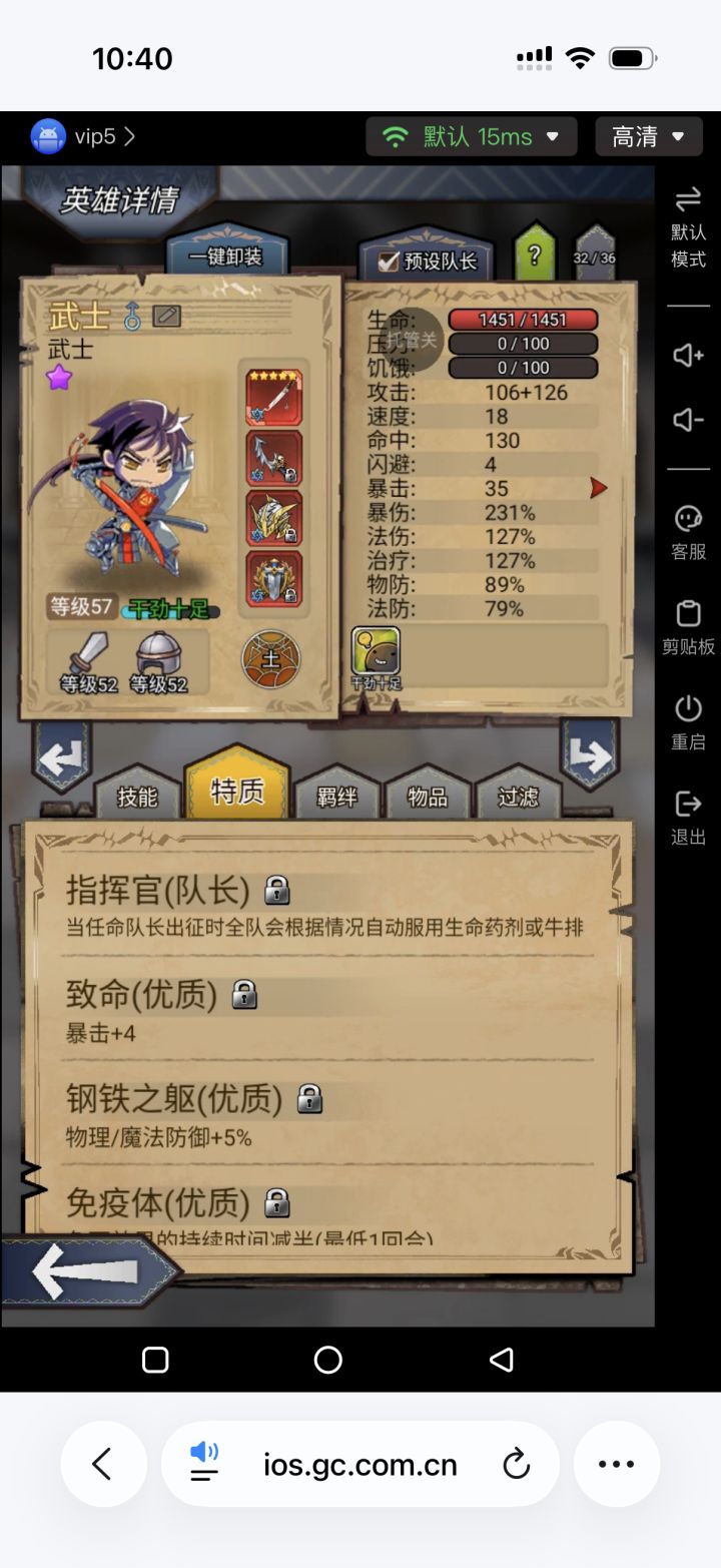 本攻略思路由群里“曲佬”提供(结合了更新的新特质)本人因配置不够稍微改动本攻略配置较高,有条件的玩家可以参考,不推荐萌新尝试只能刷4跟9尾数的BOOS图武士进阶“攻击” 装备:反击刀,专武,97头,训练命中:131 物防:80以上 生命:越高越好特质:要加暴击率的,提升武士暴击率(武士技能增加暴击率),免疫体/百毒不侵(沙漠必带), 新特质(指挥官)必带可以降低难度羁