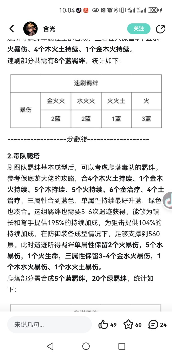 本攻略参考了暮归大佬的攻略贴。有问题随时提,看到我会回复并补完所有细节,写攻略不容易,求点赞收藏谢谢。装备看图,羁绊数量看图,羁绊要求:紫五行2攻3爆伤、N个蓝紫火爆伤、N个蓝木水治疗、1个紫土生命,我目前17-19回合无召唤稳定过600,理论上羁绊要求可以比我更低一点羁绊很少的小伙伴建议看《新版土法挂塔队(9.19定版)》,那个可以最低成本冲到600层,等羁绊起来后再转这一套阵容圣殿骑士