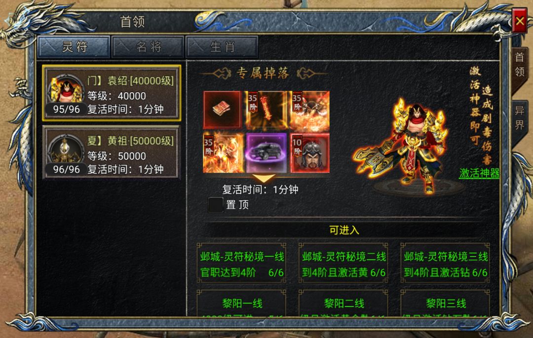 热门的挑战BOSS内容介绍来啦!挑战BOSS玩法分2大模块,首领和异界。这2部分分别能获得什么奖励呢,一起来看看吧! 【挑战首领】 这个区域要挑战的BOSS是袁绍、黄祖。根据专属掉落的奖励不同,又分为灵符、名将、生肖3块。除BOSS的专属掉落外,灵符模块会掉落500灵符,名将模块会掉落名将招募令(可用于招募名将,集齐十枚可以进行十连招募),生肖模块专属掉落丑牛·谷雨。击败袁绍的专属掉落有男版及女版