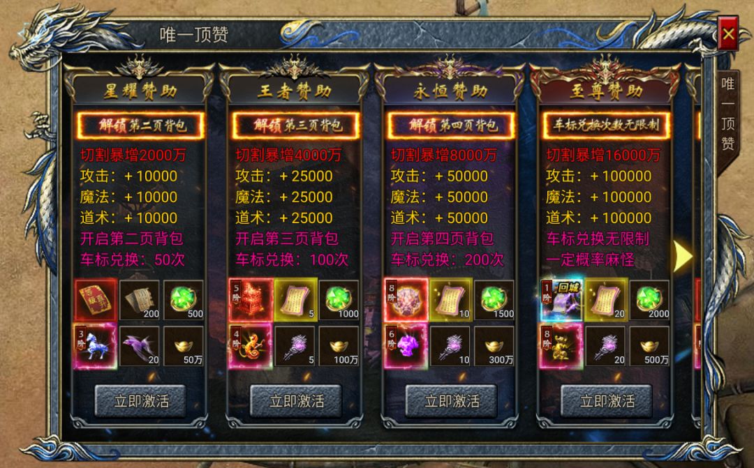 《斗罗封神传》的热门玩法“唯一顶赞”,可在游戏内右上角找到相关图标。下面由小秘书给大家简单介绍下坐骑赞助的内容吧! 唯一顶赞总共分6个等级,分别是黄金赞助、钻石赞助、星耀赞助、王者赞助、永恒赞助、至尊赞助。黄金赞助、钻石赞助开局免费赠送。每个等级均配备有专属生肖装备,分别配备寅虎、辰龙、午马、申猴、戌狗、子鼠。除了特色坐骑外,每个唯一顶赞还有专属福利,包括但不限于高级技能残页、创造宝石等等。 以至