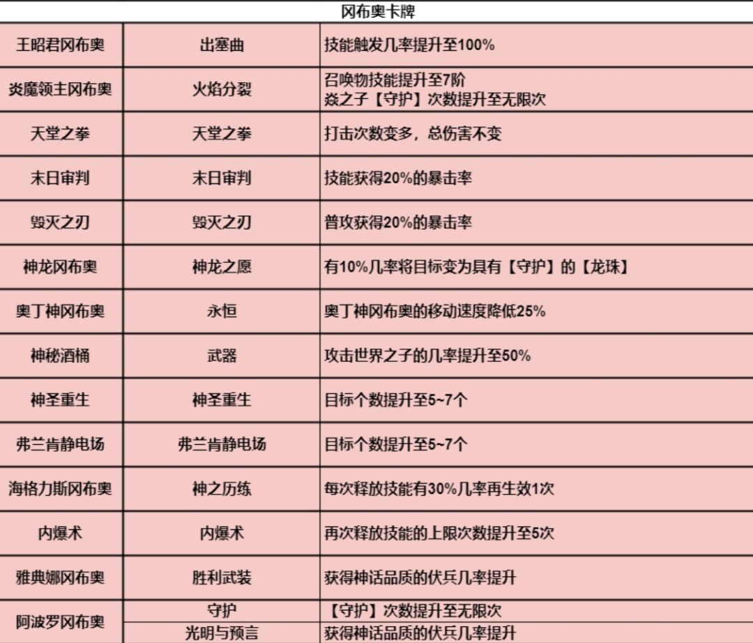 哈咯啊大家,又是我,大名鼎鼎的1区豹子头-昔年。这次给大家带来的是冈布奥20级卡牌的七阶技能效果的解析和推荐。 图1是包括了冈布奥还没出的新卡—雅典娜冈布奥在内的所有红卡的七阶技能效果的介绍,图2是冈布奥的三张彩卡的七阶技能的效果介绍,接下来给大家推荐一些比较建议用圣物升到20级的卡牌。 王昭君冈布奥:技能触发几率提升至100%,这个技能在砍树的时候,尤其是带了命运之钥的砍树阵容中算是必备