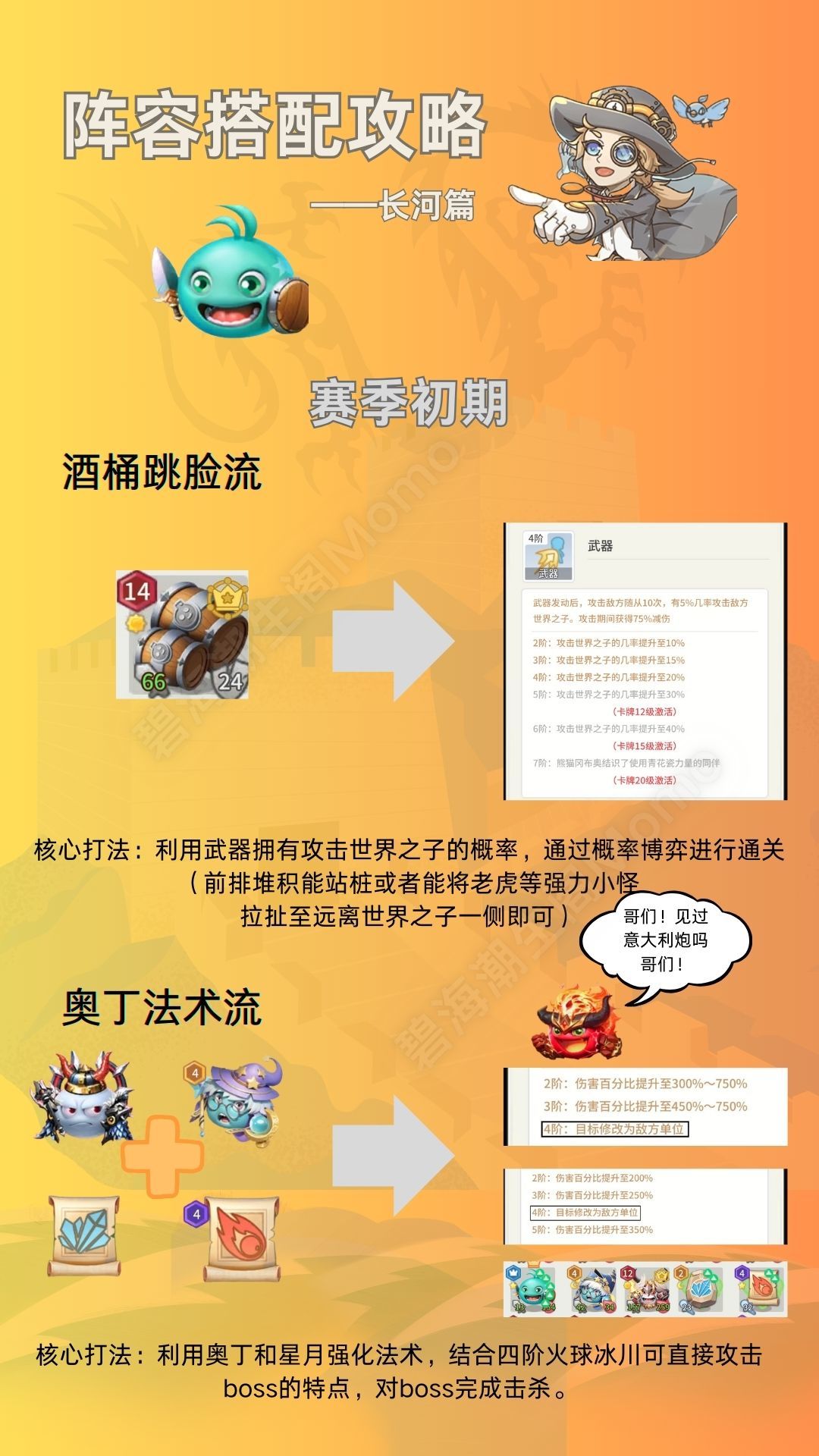 正式服是以冈布奥作为世界之子的,所以很多玩家在测试服感受的查尔文之后首次接触冈布奥,不太熟悉技能玩法,来总结下阵容搭配,仅代表个人 酒桶:关于对酒桶的评价,很多人觉得抽不到就玩不了拉,其实酒桶只适合打长河,他的性质以及队伍搭配都是拼着几率,我们正常打法是使用对阵摆位子或者使用小怪隔断阻挠老虎怪,然后去偷boss,但是酒桶的阵容玩法是直接几率攻击boss,省去了麻烦的摆位和阵容的卡死,只需要不停的打