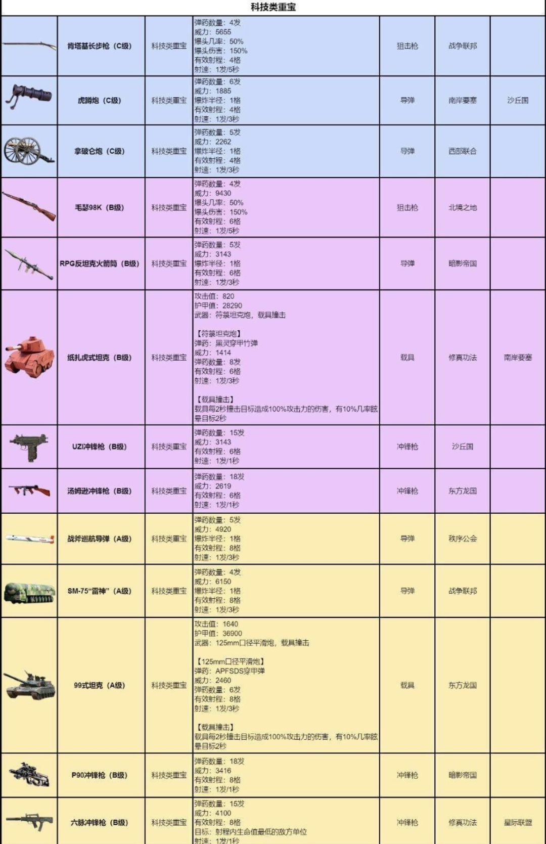 哈咯啊大家,又是我,大名鼎鼎的1区豹子头-昔年。这次给大家带来的是重宝详解-科技类重宝。 如图1、图2,重宝分为5个等级,分别是蓝色重宝(c级)、紫色重宝(b级)、橙色重宝(a级)、红色重宝(s级)、红色重宝(s+级),接下来给大家推荐一些好用的重宝。 纸扎虎式坦克(b级):这个重宝在科技类重宝中算是比较不错的存在了,尤其是在每个赛季刚开始的阶段(那时候活动周还没开启,重宝基本只能在时光机