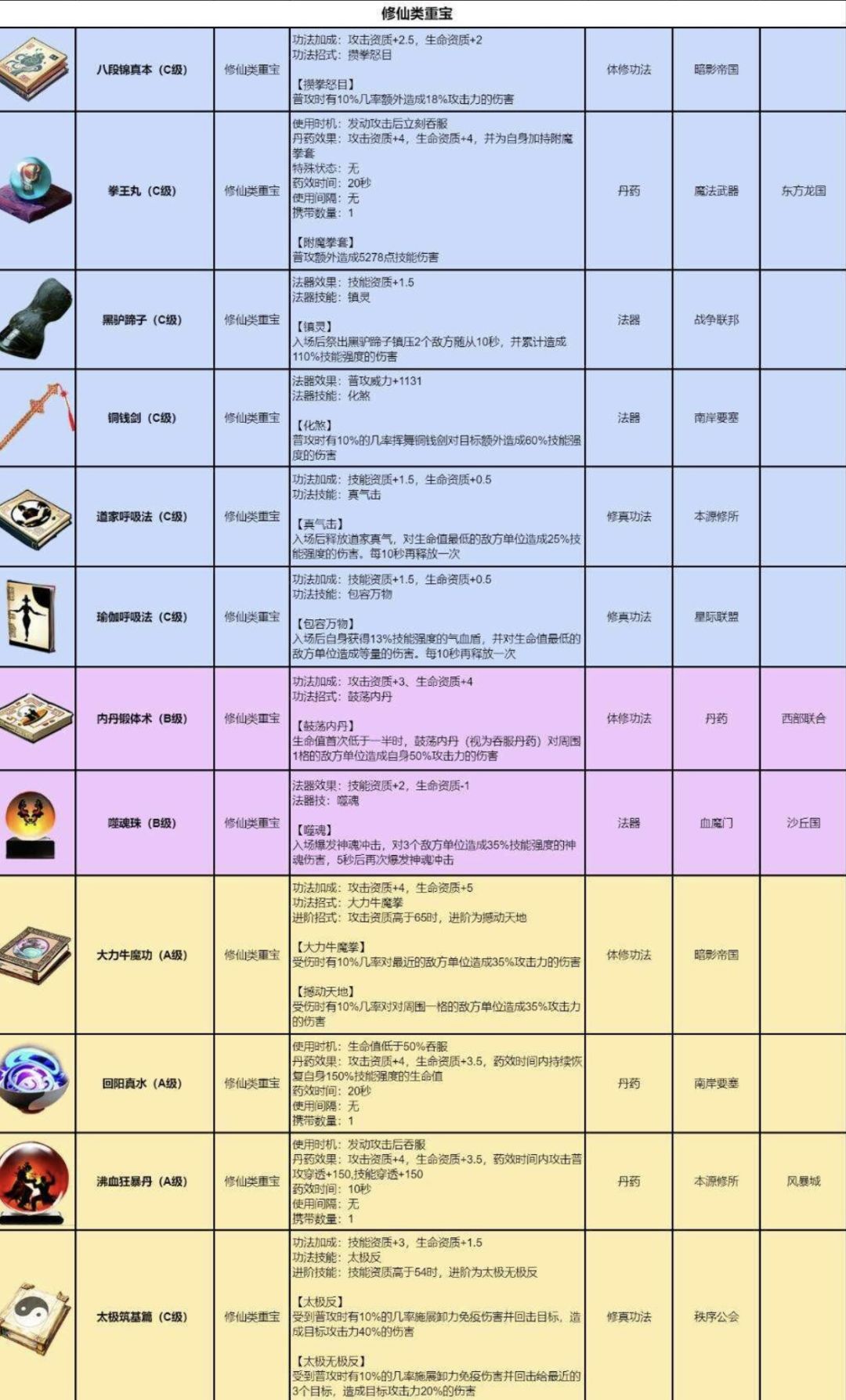 哈咯啊大家,又是我,大名鼎鼎的1区豹子头-昔年。这次给大家带来的是重宝详解的最后一篇,也是目前游戏里最强的一类重宝—修仙类重宝。 如图1、图2,重宝分为5个等级,分别是蓝色重宝(c级)、紫色重宝(b级)、橙色重宝(a级)、红色重宝(s级)、红色重宝(s+级),接下来给大家推荐一些好用的重宝。 黑驴蹄子(c级):地藏镇狱功-残的低配版本,但是镇压随从的效果是一摸一样的,前期没有地藏镇狱功-残
