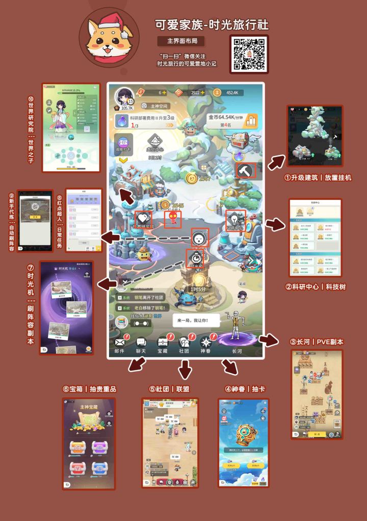大家好(๑╹◡╹)ノ”我是笔阀!好久不见,被好朋友安利过来,努力开荒期间,拼拼赶赶给大家整出这篇攻略!话不多说,先整上我们的主界面大图!喜欢的小伙伴,可扫码关注“时光旅行的可爱营地小记”🎮攻略合集❤主界面布局❤【首日开荒思路】跟着【主线任务】走,记得点猫猫阿布获取金币,解锁完【世界研究院】进入长河,别忘了升级建筑拿基因点,研究完后再去打架,解锁时光副本后就开始了循环:长河刷阵容→建筑升级