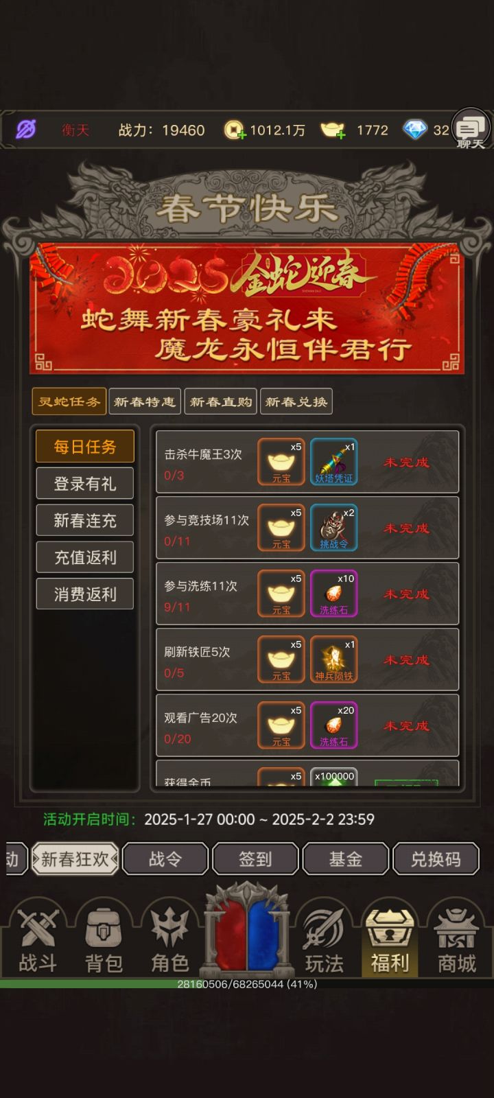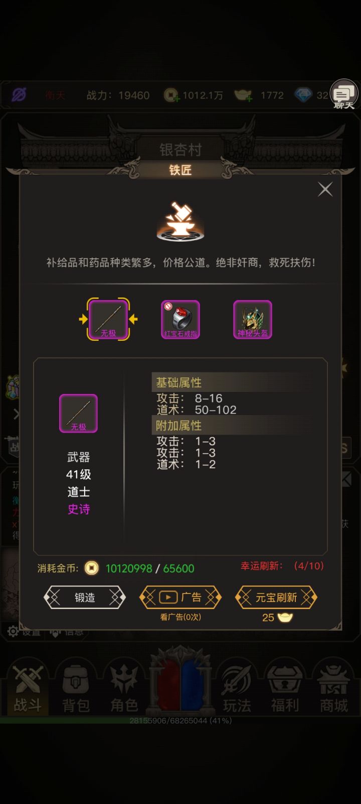 进游戏最好进新区,刚开一秒那种,开局先找群主领一张免广卡 在邮件用了之后。把群公告的兑换码全兑换,在游戏福利处。然后把能看广告的地方全点了,铁匠 每日签到 金币 背包 仓库 这几个然后跟着游戏任务走,有条件这里可以冲个5块,因为每天只有5钻白嫖,新手武器要6钻这个性价比超高,能用很久大概手动一小时会卡战力了,就可以强化身上的装备,用金币和送的元宝开宝石槽,这个是永久的不会浪费,前期最多每个部