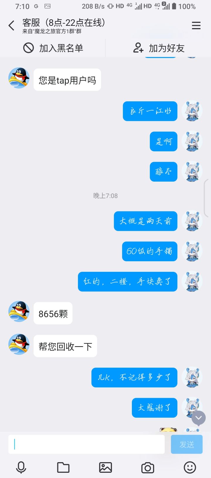 几天前不小心卖错装备亏损了很多洗练石,在群里得知可以找客服帮忙找回来就去问了,真找回来了,太感动了。客服人很好说话,这游戏也不氪金,休闲游戏,群里的大家伙都是好人啊