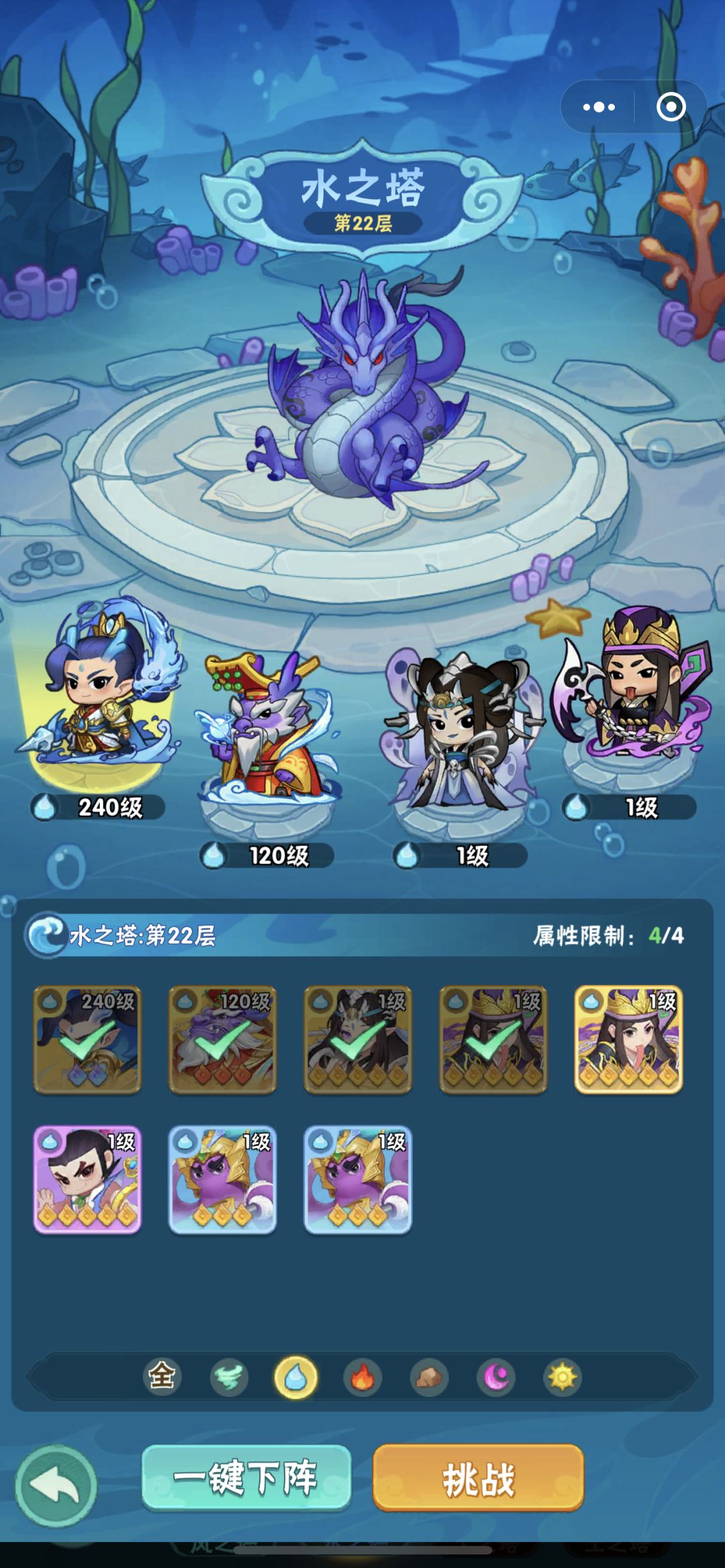 建议选择敖丙+龙王, 敖丙主要输出,龙王打控制, 敖丙升满级,这样输出能力就有了,龙王可以减速控制,另外两个英雄直接一级就行了,这样不占用, 游戏初始技能格子,可以加攻击力或者攻速,攻击力和攻速分别有3-6-10,如果刷的3的比较多,可以重新进几次,尽可能的多刷6%和10%,轻松拿捏, 里面把主要输出放到第一排,尽可能合成敖丙, 水关卡,每过一天,可以降低敌人移动速度15%不增加步数的情况,最多4