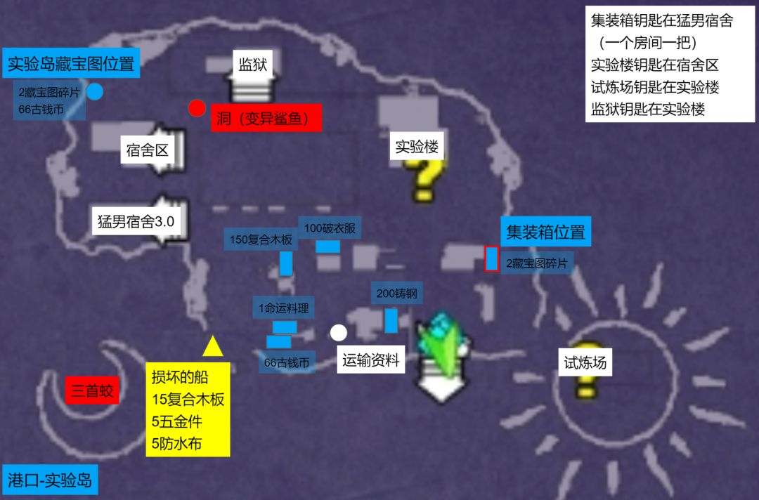 #阿瑞斯病毒2攻略 实验岛共6个集装箱,6把集装箱钥匙全部都在猛男宿舍3.0,因为集装箱钥匙用过,背包内道具会使用消耗掉,不显示在背包内,建议找齐6把集装箱钥匙后,统一去开集装箱,避免拿了一部分,用了一部分,无法核实自己一共拿了几把钥匙,哪里拿过哪里没拿; PS:这里需要说明,邮轮一共10个集装箱,10把集装箱钥匙都在邮轮二三层,如果邮轮和实验岛的集装箱钥匙不分开一次性用完,后期发现有遗漏的时候