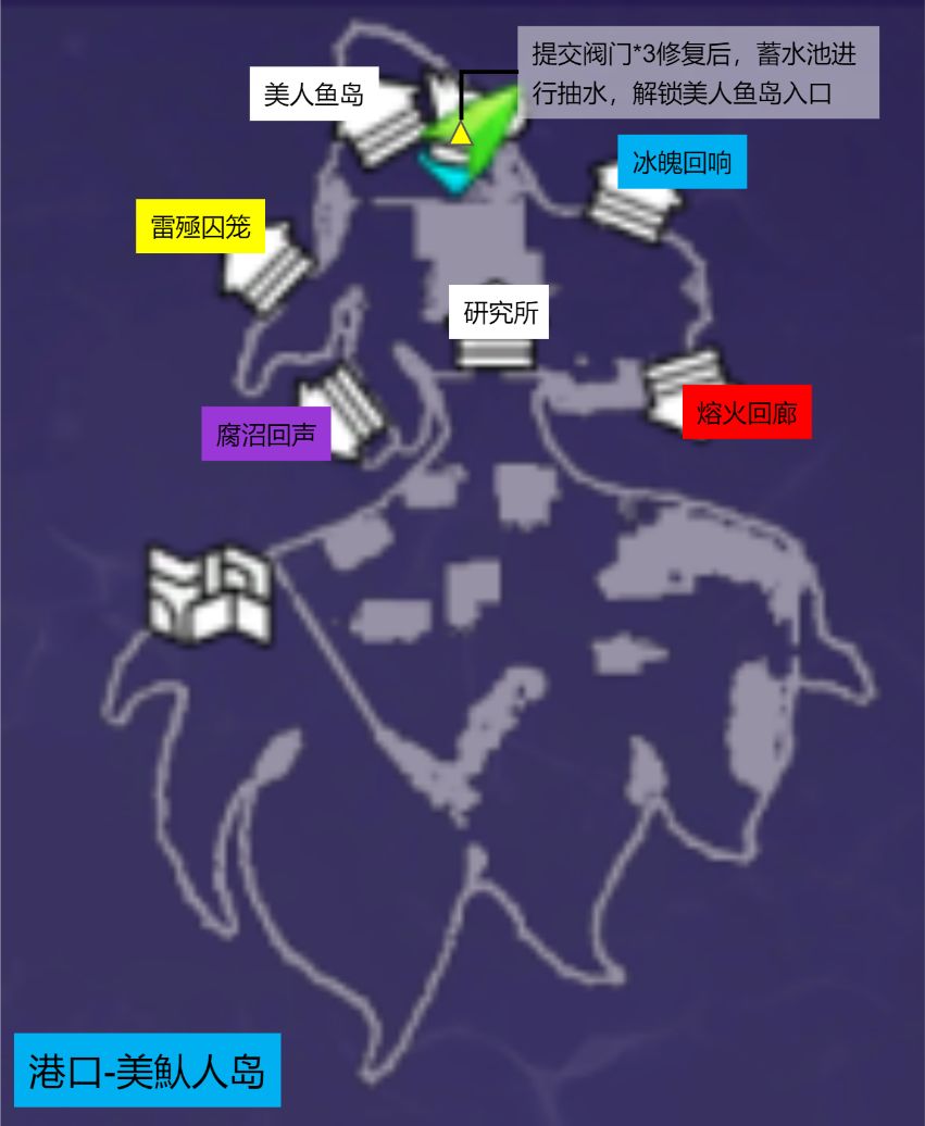 #阿瑞斯病毒2攻略 含美魜人岛、美魜人岛-研究所、美人鱼岛、美人鱼岛-地下迷宫一览图攻略 ①美魜人岛的四个生态环境:雷殛囚笼(雷)、腐沼回声(毒)、冰魄回响(冰)、熔火回廊(火)玩法涉及到元素血清、元素抗性药剂,详细流程可跳转下方链接; 阿瑞斯2尼奥终章元素药剂流程一览图攻略: https://www.taptap.cn/moment/695298473875997565 ②美人鱼岛解锁条件:美魜