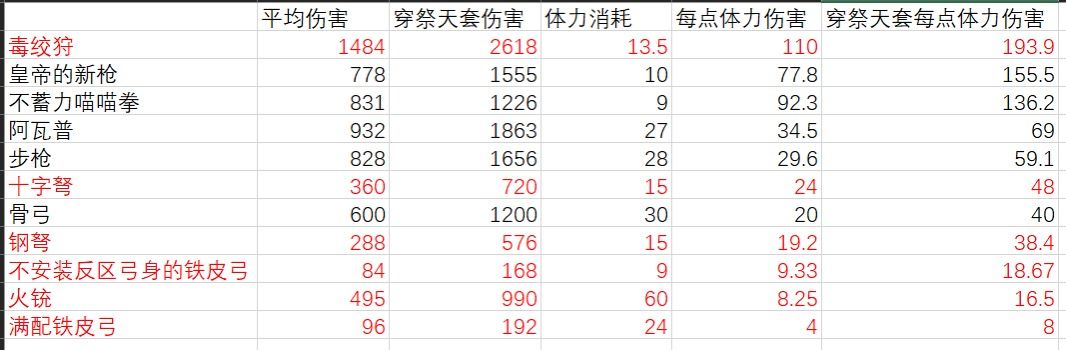 武器按照满配计算,红色是必须蓄力的武器。