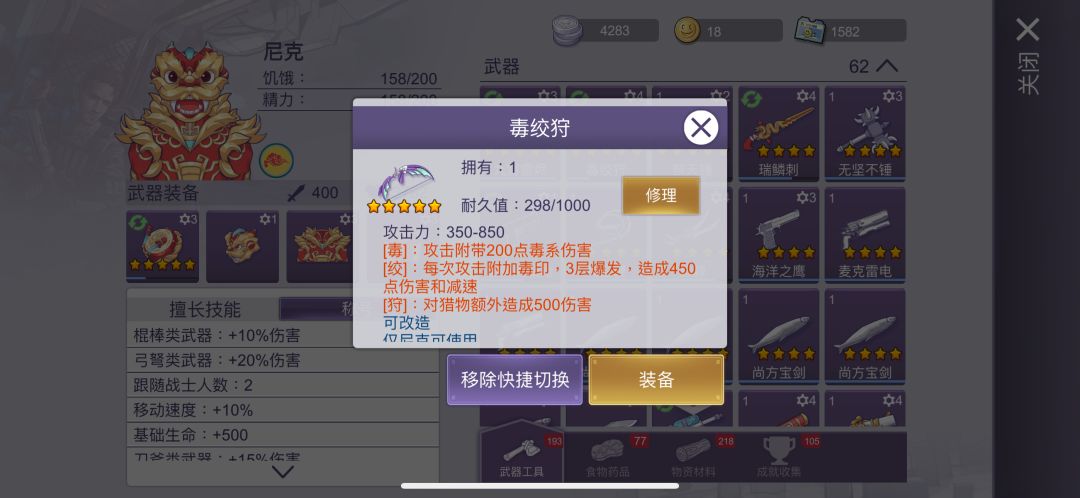 1. 新增近战武器:流星锤 四星金星,耐久1000,破甲 修理方式为50份生铁和10份粘合剂 获取途径为氪过游园镇礼包增送 伤害200,蓄力时间1秒,可击晕敌人1秒,体力消耗少 每蓄力n秒,造成200n伤害,击晕敌人n秒,体力消耗越来越大,上限5秒, 攻击范围大 配件: 豪猪王刺。每蓄力n秒附带100·n秒伤害、150·n秒流血伤害 舒适把手。-10%体力消耗,-10%蓄力时间 +40伤害 2.