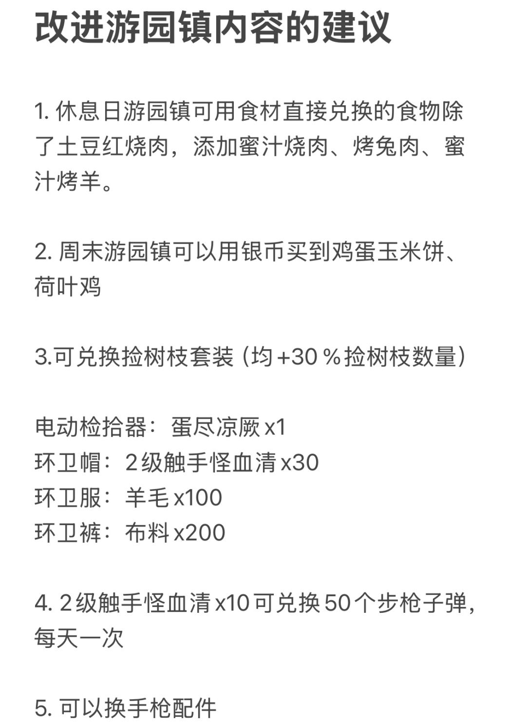 1. 休息日游园镇可用食材直接兑换的食物除了土豆红烧肉,添加蜜汁烧肉、烤兔肉、 蜜汁烤羊、鸡蛋玉米饼、荷叶鸡 2.可兑换捡树枝套装 (均增加相同的捡树枝数量,俭素知装备) 电动检拾器:蛋尽凉厥x1 环卫帽:2级触手怪血清 环卫服:羊毛 环卫裤:布料 3. 2级触手怪血清可兑换30个步枪子弹, 每天一次 4. 改成100个黄帽子能换200个银币 5. 游园镇远征地图情报改为很多银币买断, 随时随地可