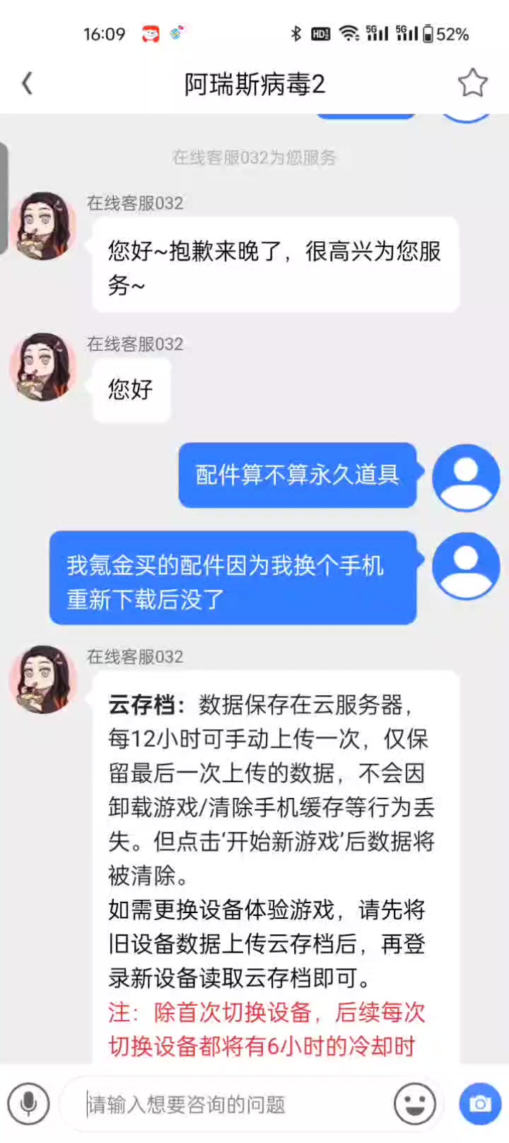 三个多小时没处理了,我换手机重新下载后氪金道具没了,他告诉我可以找npc重新领但是每一个都没有,他告诉我因为没云存所以一次性道具没了哪怕是氪金的,但是你告诉我阿瓦普涂装是一次性道具?这是武器配件啊,不是我拿钻石买的200电线圈和蚊鸣球#阿瑞斯病毒2