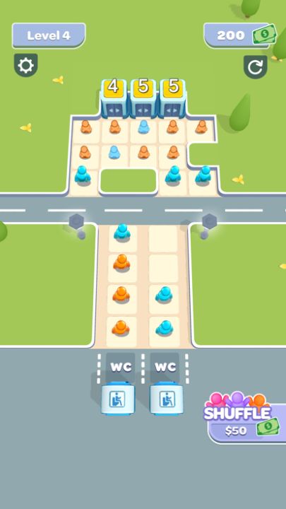 Toilet Queue is a color-sorting puzzle game where you aim to sort the people in the queue by their colors and make them use the toilets.