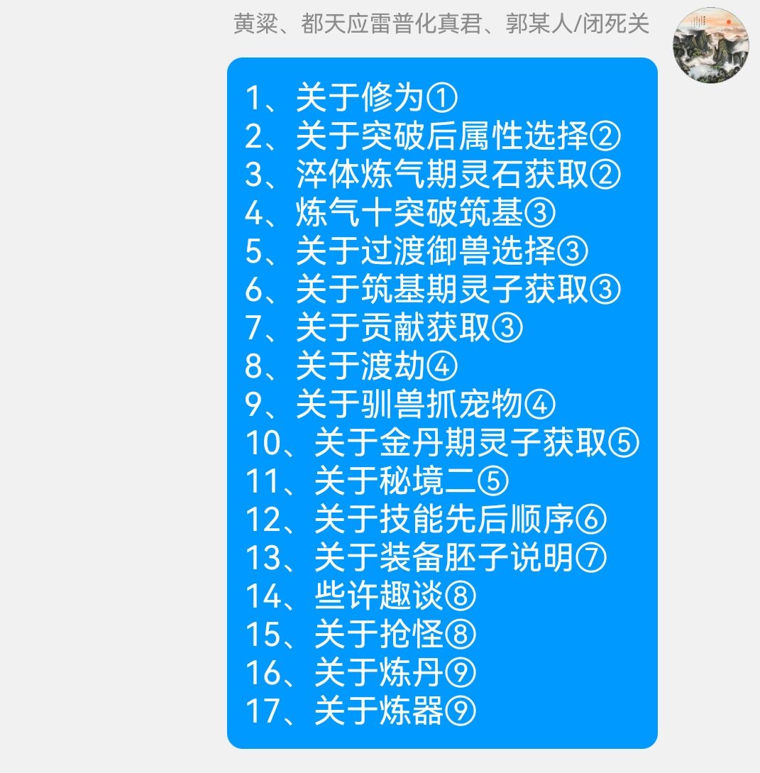 不少道友刚开始进游戏都有些蒙圈,不知道怎么玩或者说不知道可以做些什么,所以开个贴简单说一下新手阶段应该做或者能够做的一些事。 本游的的主线只是带你逛逛玄天宗,并不对玩家自身发育起到任何引导和帮助(在秘境一的任务之前会卡一下等级,按提升渡过后,不再有任何限制)。 过完主线后,你可以: 1.升级(坊市有很便宜的橙皮,一次捐赠可得180贡献,正好够一次玄阶修炼室,可升级至淬体67,因为等级太低在线打