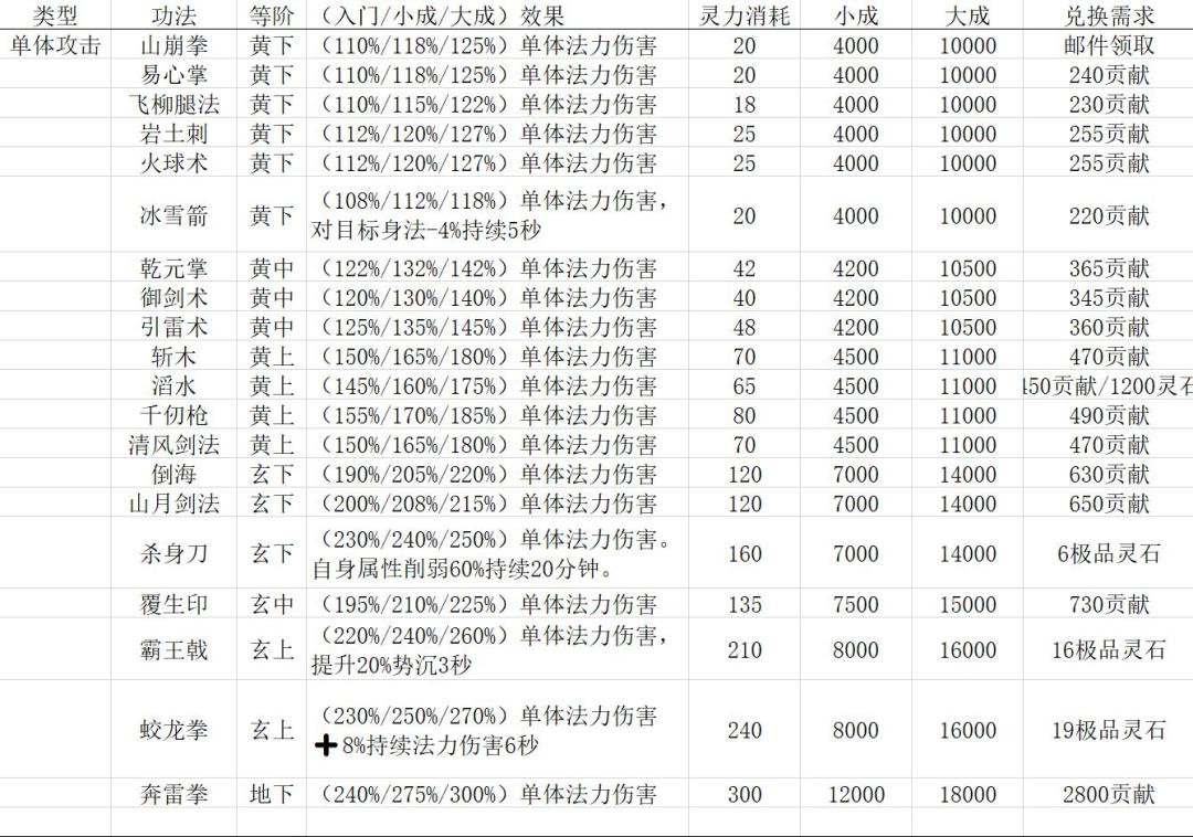大家好,我是梦求真。最近看到很多小伙伴说功法没有介绍,不知道换什么。所以我略微整理了下功法,总共分单体攻击、持续攻击、多段攻击、群体攻击、法力buff、肉身buff、护盾buff、身法buff、回血buff以及特殊功法总共10大类。大家可以根据自己的喜好去藏经阁或者仙宝阁兑换。Tips:5⭐功法:山崩拳。性价比之王,练到后期更是只要10灵力就可以释放。5⭐功法:血煞功。全游戏唯一无上限加属性功法,