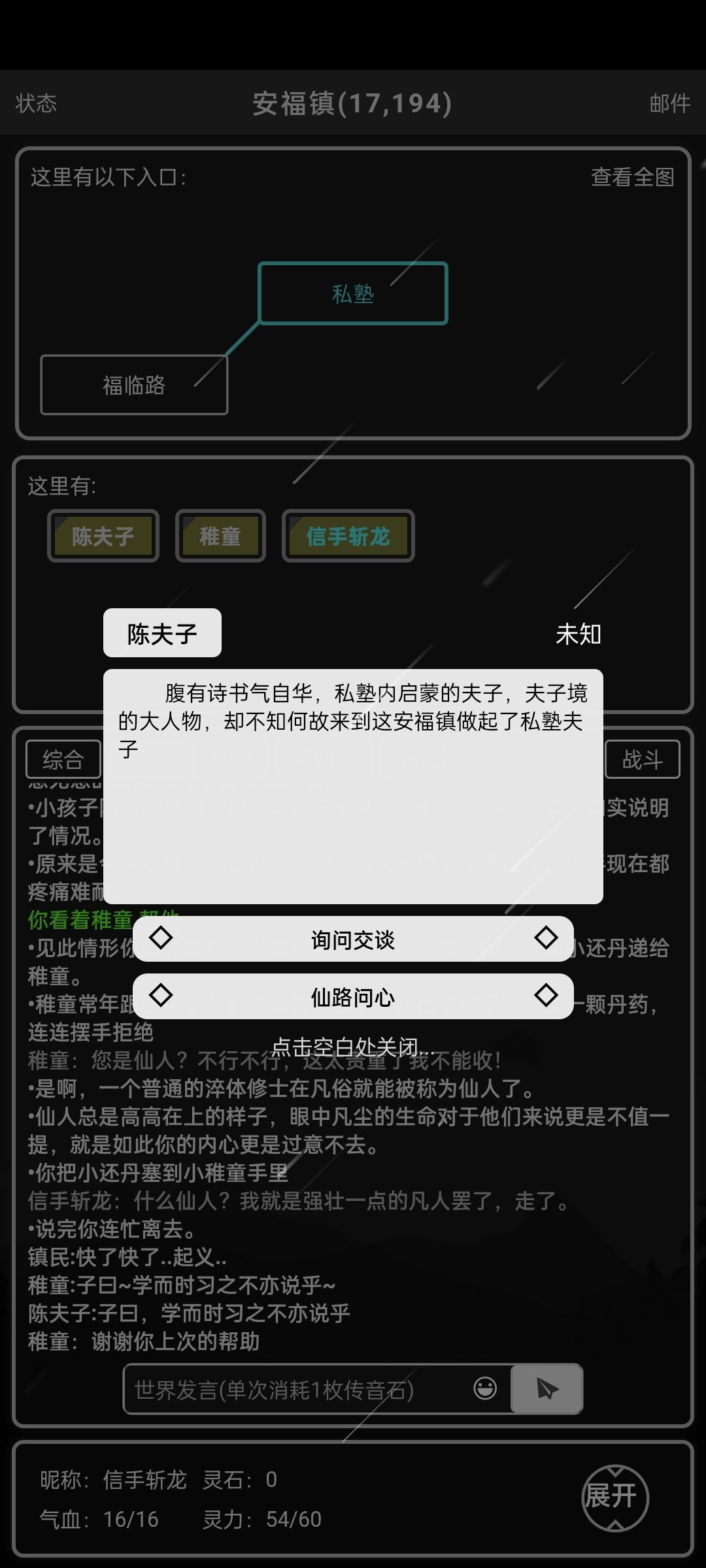 陈夫子这里有一个《仙路问心》的任务,总共5道题,都是公务员考试的题,比较简单。按照人物等级给经验,每天一次。必做。 旁边的小童这里有一个支线,需要30灵石去苍龙城买一个小还丹,给25修为。可以做可以不做。推荐必做