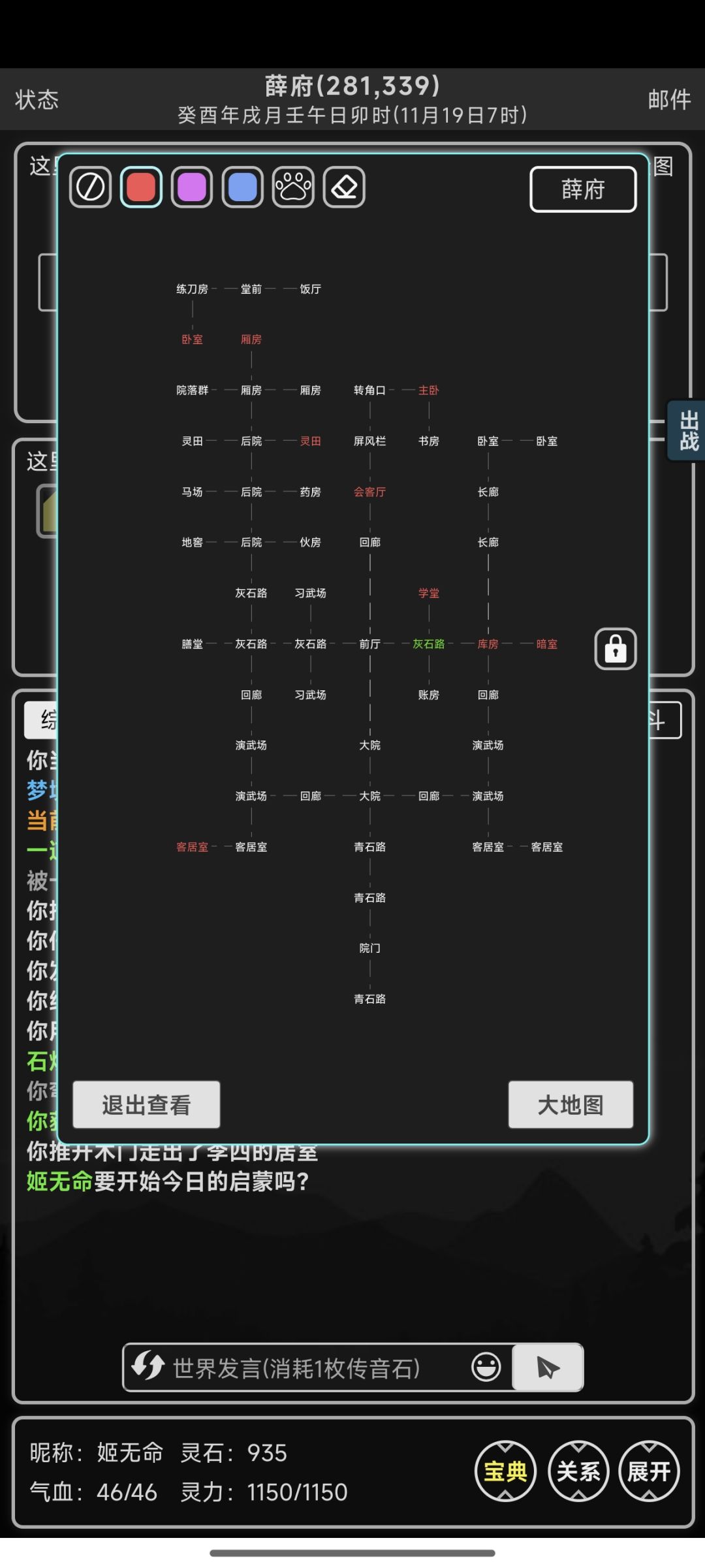 前期的主要目的就是赚取灵石提升修为,为了更好的赚取灵石和增强战斗力,必须得养一只宠物,目前前期最通用的宠物便是雪山的寒冰猛犸,简称大象,你可以委托群中的老祖们,长老真人们,帮你抓取,一般来说3000~4000灵石左右的大象就够你用了 过完主线任务之后记得到玄天宗安神峰购置一处洞府,任务到你前往陆巡师兄住处之后让你练气期再回来,这时候我们的前期主线任务完成了,你就可以自由游玩了 前期去地图上的“野外