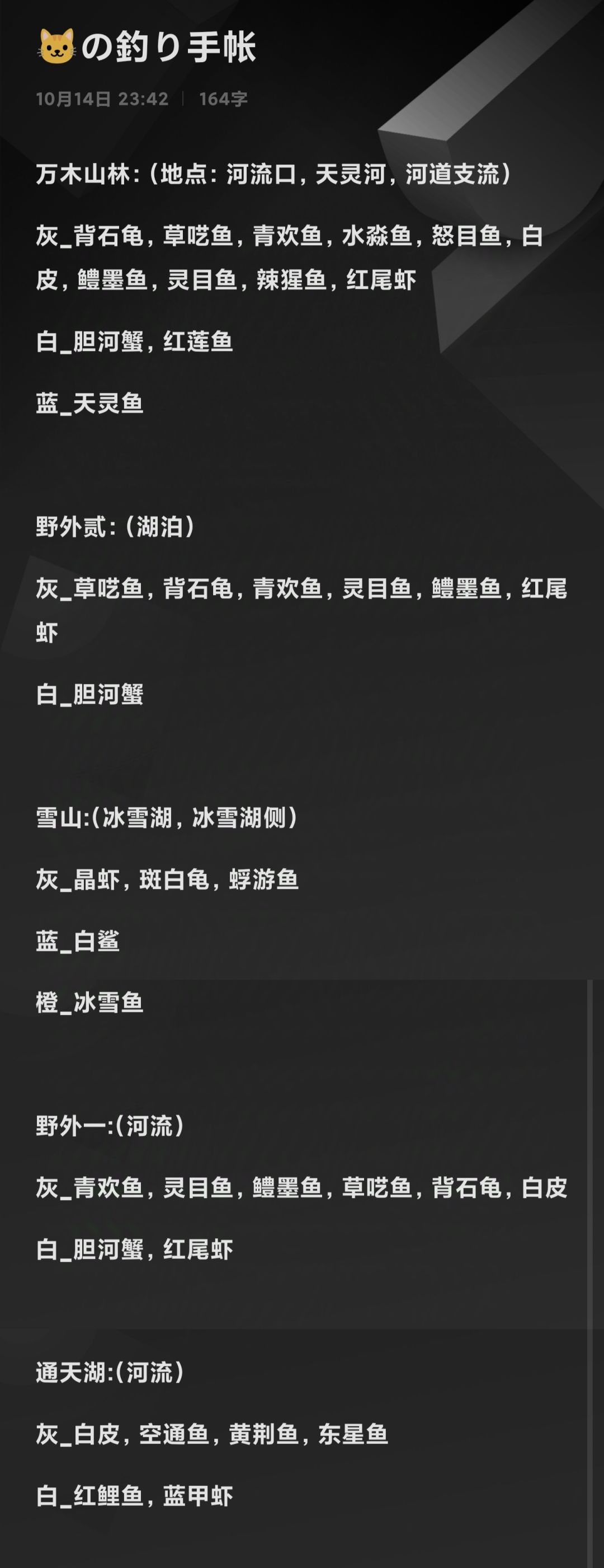 这是我钓了2个星期在各个地方整理出来的能钓到的鱼,其中要是缺少的评论区可以补充。 1:鱼饵可以摇桃树,或者雪山聚集地购买,药神谷也有桃树,需后撤几格冲进去。 2:不同颜色出售的绑灵价格不同,除了几种能兑换飞舟的鱼,其他的目前可以直接出售。 3:稀有鱼类和浸水宝箱,普通鱼类与收钩速度有关,快速收钩稀有鱼类概率更高 4:每天有100次左右的甩钩次数,对不需要后几个飞舟的浸水宝箱可以直接开启,概