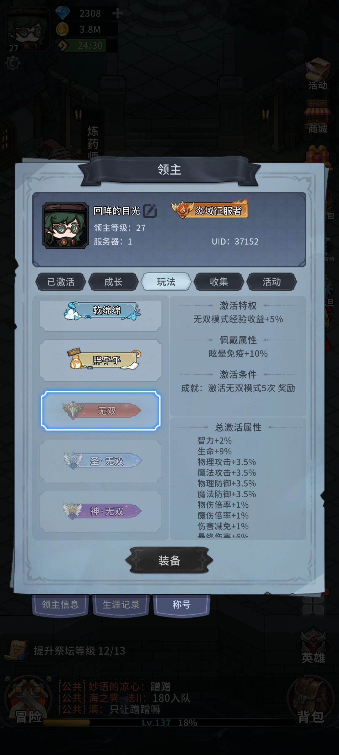 13、关于装备属性(胚子)。 仅代表个人观点。 白装没必要强化。 绿装淬体一就可以穿,攻击持有、甲啥的上限好像8+1,防持鞋子3?,辅助6? 就图一乐呵,没强化必要,一套+4绿大概一百肉法吧。 蓝装要炼气六才能穿,具体多少没太留意,比绿装大概强了一丢丢,武器甲啥的好像14+1?,防持+6?不知道记错没,辅助没留意,大概10左右。 紫装要筑基六可以穿,强化成本4000+,武器甲啥的,上限