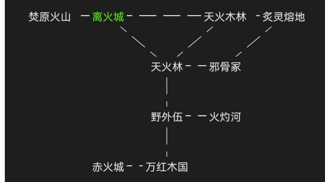 到离火州需要在妄日城的大传送阵花费15灵石传送到离火城-离火广场。回中州-妄日城只需10灵石。 目前离火州内容好像没更新完,就简单记载了些现在有的东西。 以下地图按从左到右,从上到下排列。 {焚原火山} 妖兽: 火芋鸟(筑基后期):妖兽血肉(蓝),火羽 地阳火(筑基巅峰):地阳心 [离火城] 功能: 仙宝阁(235,238)(血脉丹,凝神香) 离火广场(235,241)(大传送阵) 丹材铺(235