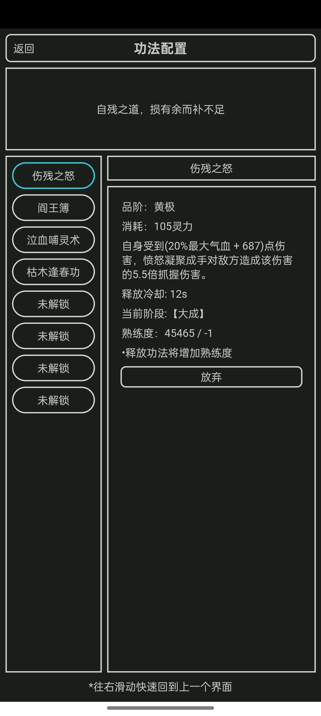 功法配置: 四个格子分别是枯木逢春功,泣血哺灵术,伤残之怒,阎王簿(后期换个恨意刀就在当前版本圆满了),恨意刀冷却长,可以跟阎王换着用,只不过循环设置会复杂一些,如果有更多格子则更容易,六个格子甚至能加水盾抵消技能反伤,七八个格子可以再加魔像和玄龟,那样就彻底没反伤了。 关于打老虎和刷技能: 如果是4格打虎要注意一个极为重要的机制,那就是伤残和阎王反伤把自身的血量降为0时,玩家是不会当场暴毙的