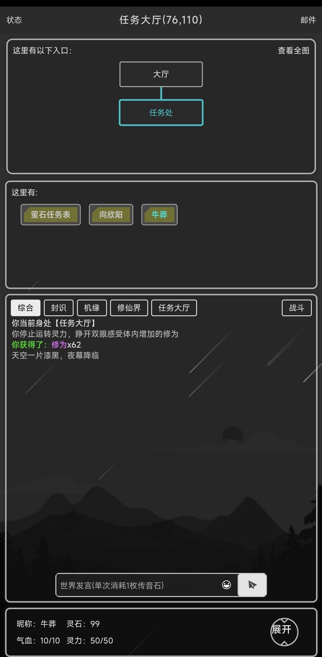 如果没有接触过文字游戏的道友们,不妨看过来,官方攻略,通俗易懂,轻易上手! 没有玩过文字游戏的道友们看着这个界面的肯定是一脸懵的状态,没事,就由我来为大家一一介绍一下。 我们从上往下看,依次为地图,生物,事件窗以及其他功能按钮。 先点击这个展开,再点任务,就出现了我们的主线剧情。 如果找不到路,可以打开地图看一下,最顶上有坐标,我们需要做的第一步就是往右边走三格,再往下面走一格到客栈开始主线剧情。