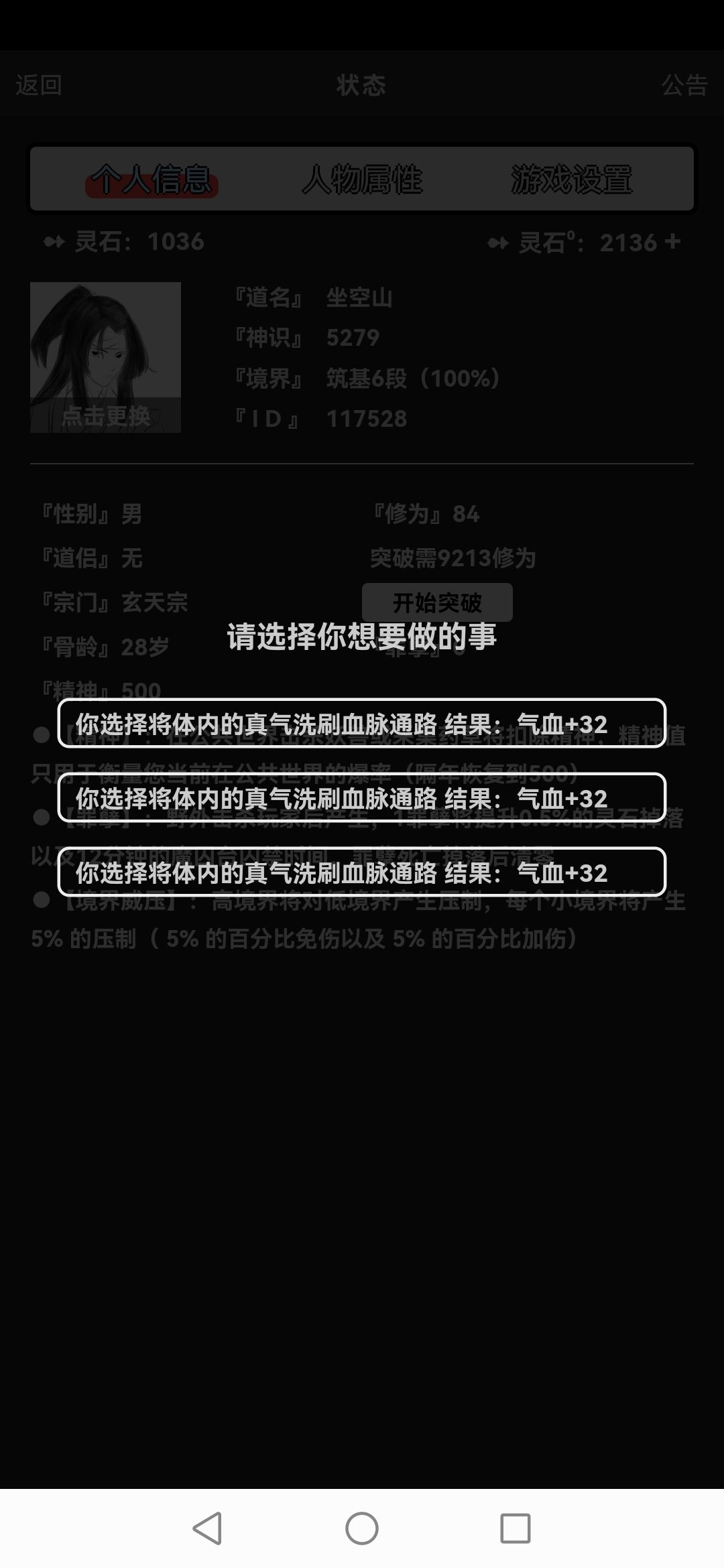 接上一贴 不要吃加血量上限的丹药,有个技能关乎血量永动机,血低就可以永动机。 突破选项有三种,肉身,法力,气血,有时候三个选项可能一样,看脸,除非没得选,不要选血,肉就是防御,法力输出,各人有各人看法,我选择全法(后面的确扛不住元婴怪ԅ(¯ㅂ¯ԅ)),可以肉法适当……打元婴怪可以猛犸扛,叠毒磨死(扯远了)但拉不住仇恨,扛不住就是死字。 每天的问心别忘记了,在平安镇(好像是这名字)书啥来着,有