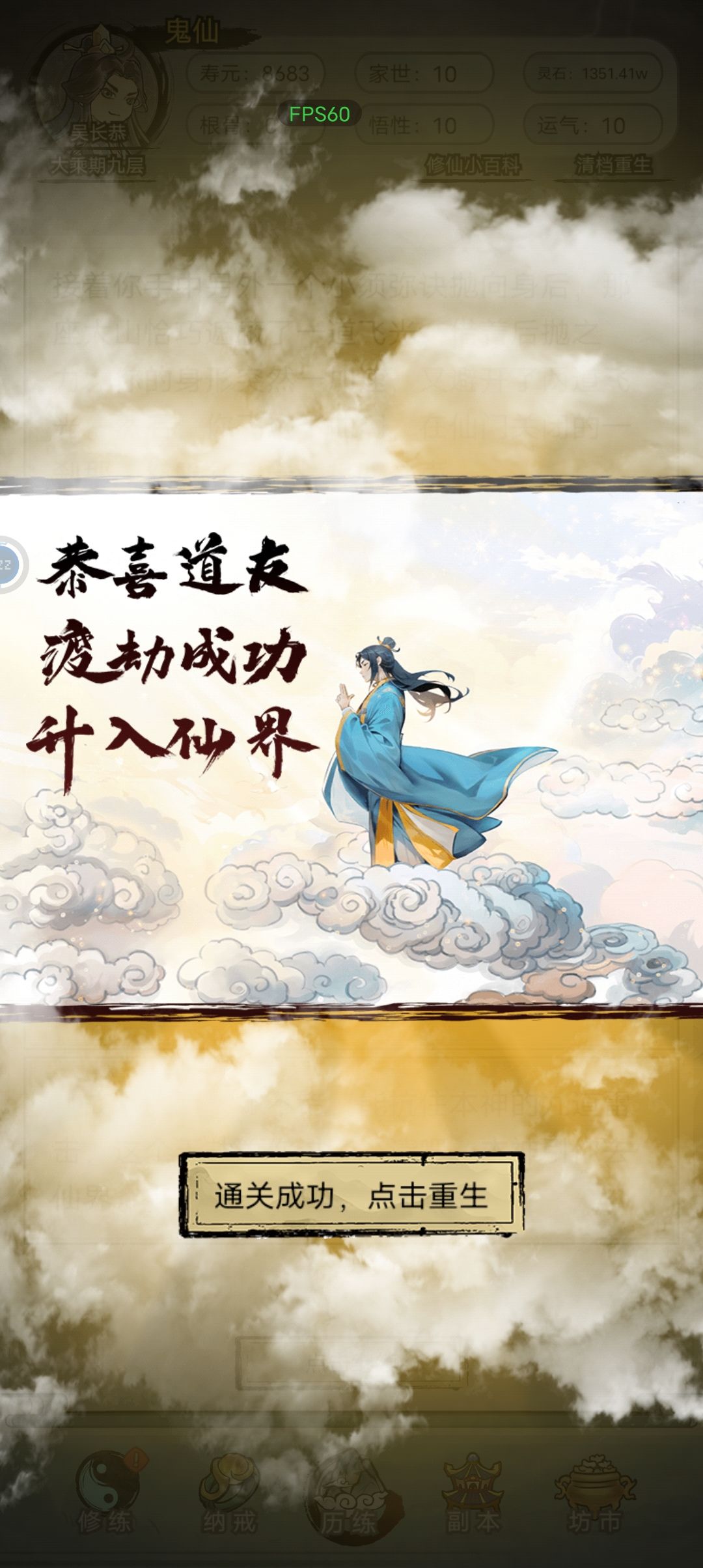 1、飞升 我走的鬼仙路线,首先在女鬼剧情选择放她走,然后在副本获得百鬼夜行功法。功法10级且境界达到大乘期,寿命耗尽生效。鬼仙之后寿命变成9999,战力低的可以在这个阶段疯狂堆。 2、传承 游戏设定的传承和平常的不太一样,也可以理解为成就。 目前我一共获得了两个传承,不打算刷了,条件未知不好搞。 第一个成就:躺枪 天赋全点根骨和悟性,气运和家世都别点,选择天赋也注意不要点到,然后概率会刷到,一岁出