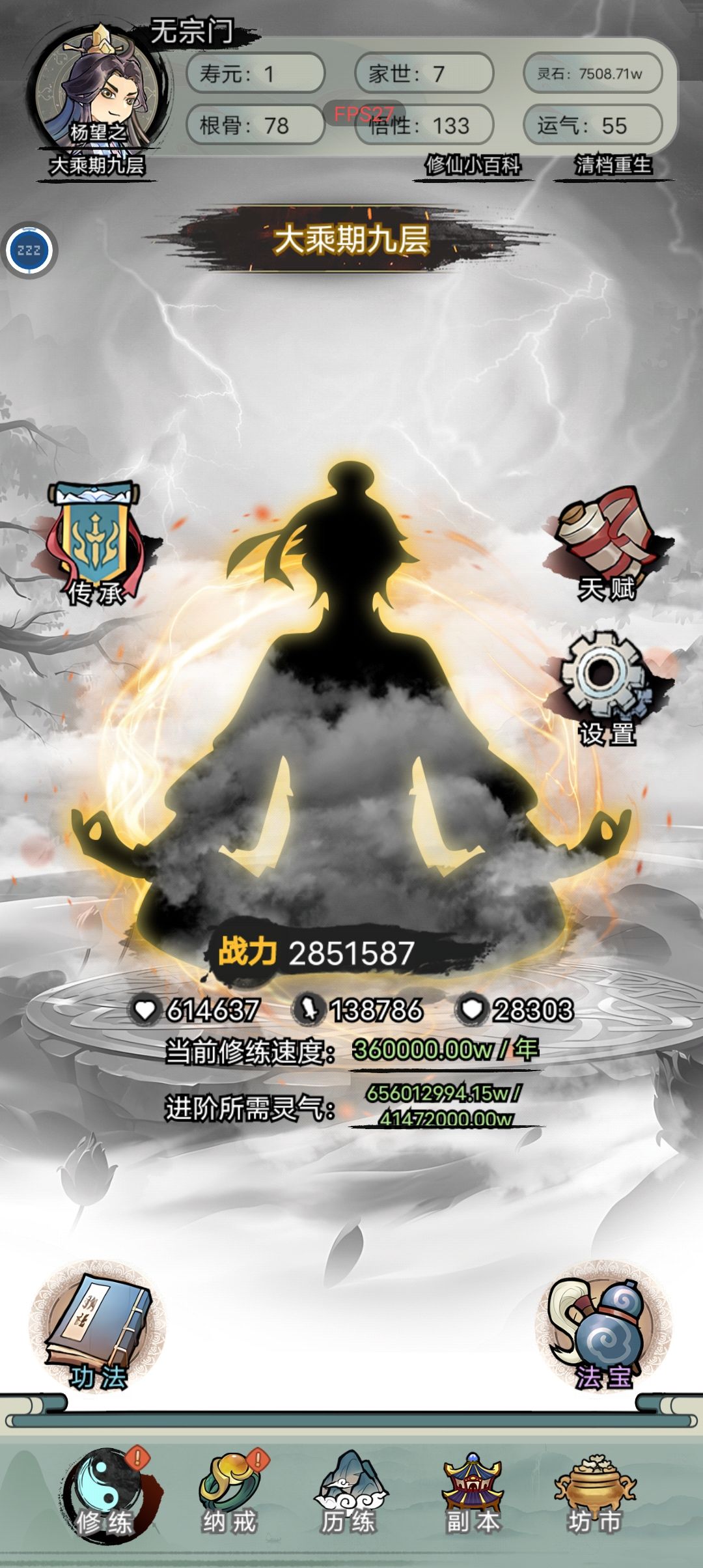 1.开局7点世家(前中期可以白嫖家族物质,用不上的还能卖钱),剩下平均分配即可,天赋尽量选加悟性运气的,悟性高了破阶不用吃药,悟性不够用寿元炼丹,前期千万别浪费钱买破阶丹。 2.选项奖励的真气丹通通卖掉,买属性丹药,前期钱少就优先悟性-根骨-运气-属性,后期不缺钱了全买,无脑氪药。特别是采集任务后面给的一气丹一个1200w。 3.功法拿到第一本地级就可以开始连续融合了,融到100封顶,后面天级也是