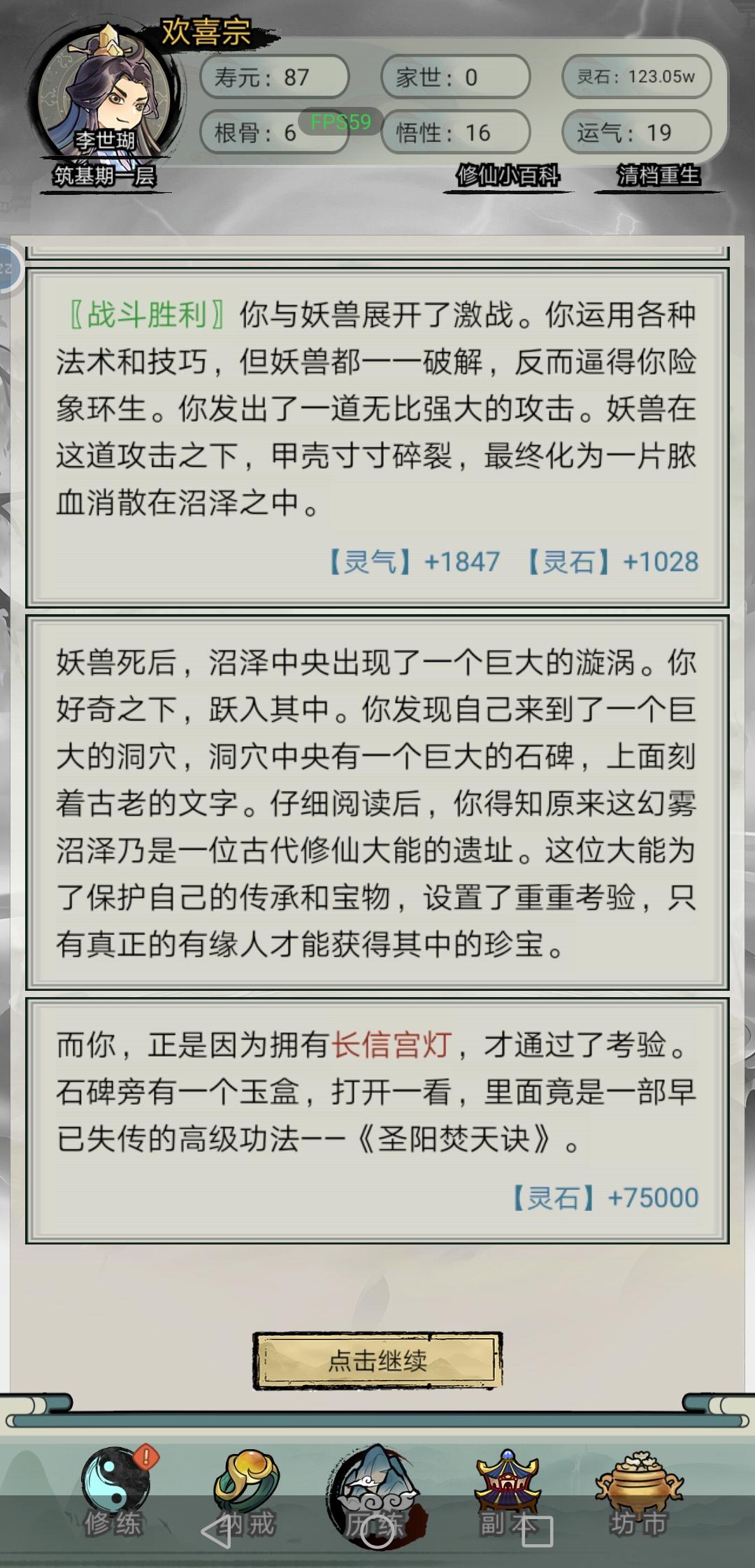 最好是先玩一个轮回,到元婴,然后可以重生带一件宝物重生,有这件宝物,前期战力随便打了,前期几万战力就够了。家世为0,气运拿10,根骨和悟性,优先悟性,这样开局,前期战力有保证,可以稳过前期的副本,悟性100在之前元婴下一个境界之前基本上不用吃丹药突破,省钱。悟性至少刷个100左右,根骨50以上就行了。 开局之后:快速突破到筑基第一层,然后不要点突破了,筑基了游历,才会遇到神药谷的事件,打败那两个