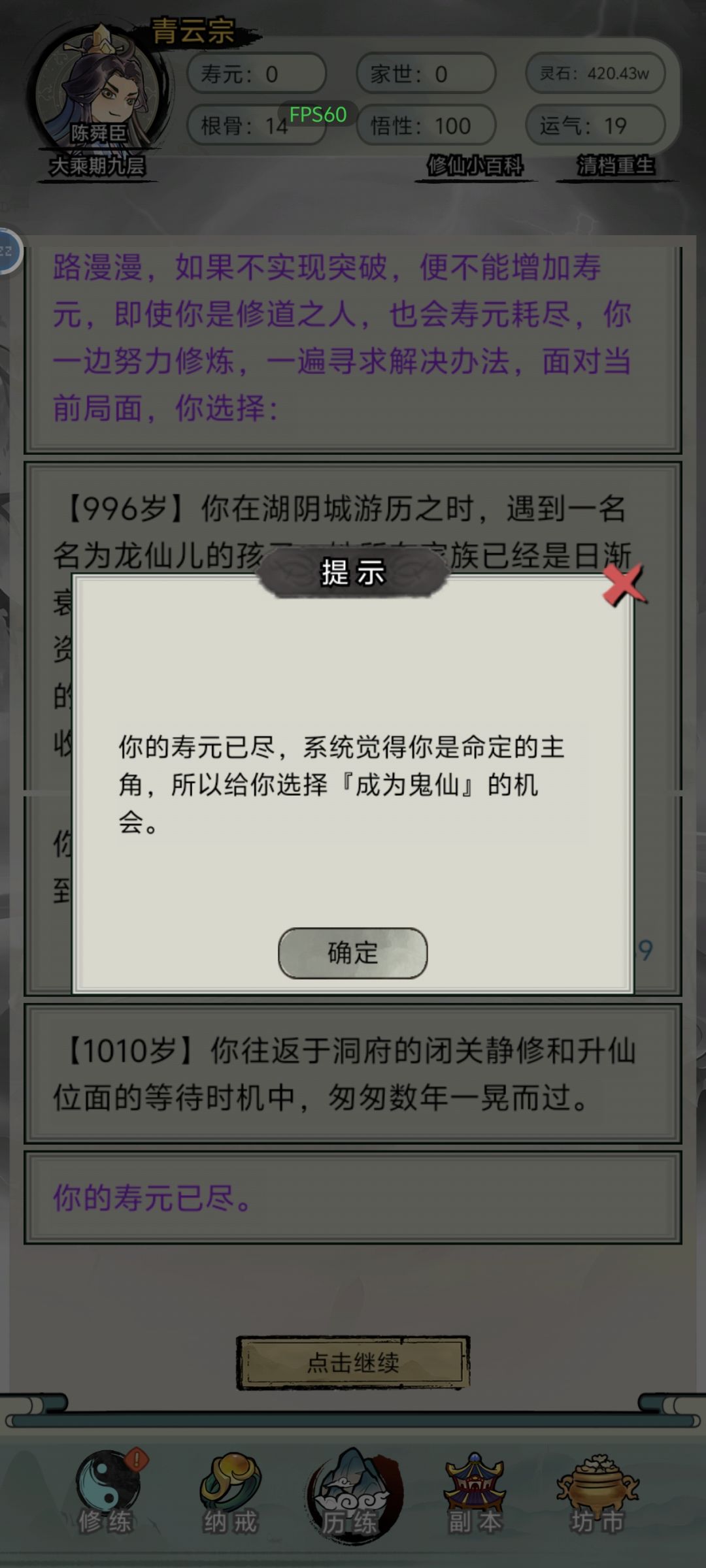 就第一遍要看几个广告,往后基本不用,礼包码不能用,门派青云要10世家,其余门派都要0,气运点满。 根骨悟性完全没必要刷,看好寿命别死了就行,修为不够就闭关看几个广告,突破到下一个境界。鬼仙要结丹游历触发,转了鬼仙得人族传承。 剧情说没有仙缘的不用管,飞升那个任务做完就飞升了,130万战力就够用了,天赋也没啥用,最好都要加气运的。 200多分,一轮就十几分钟一局,没啥意思了