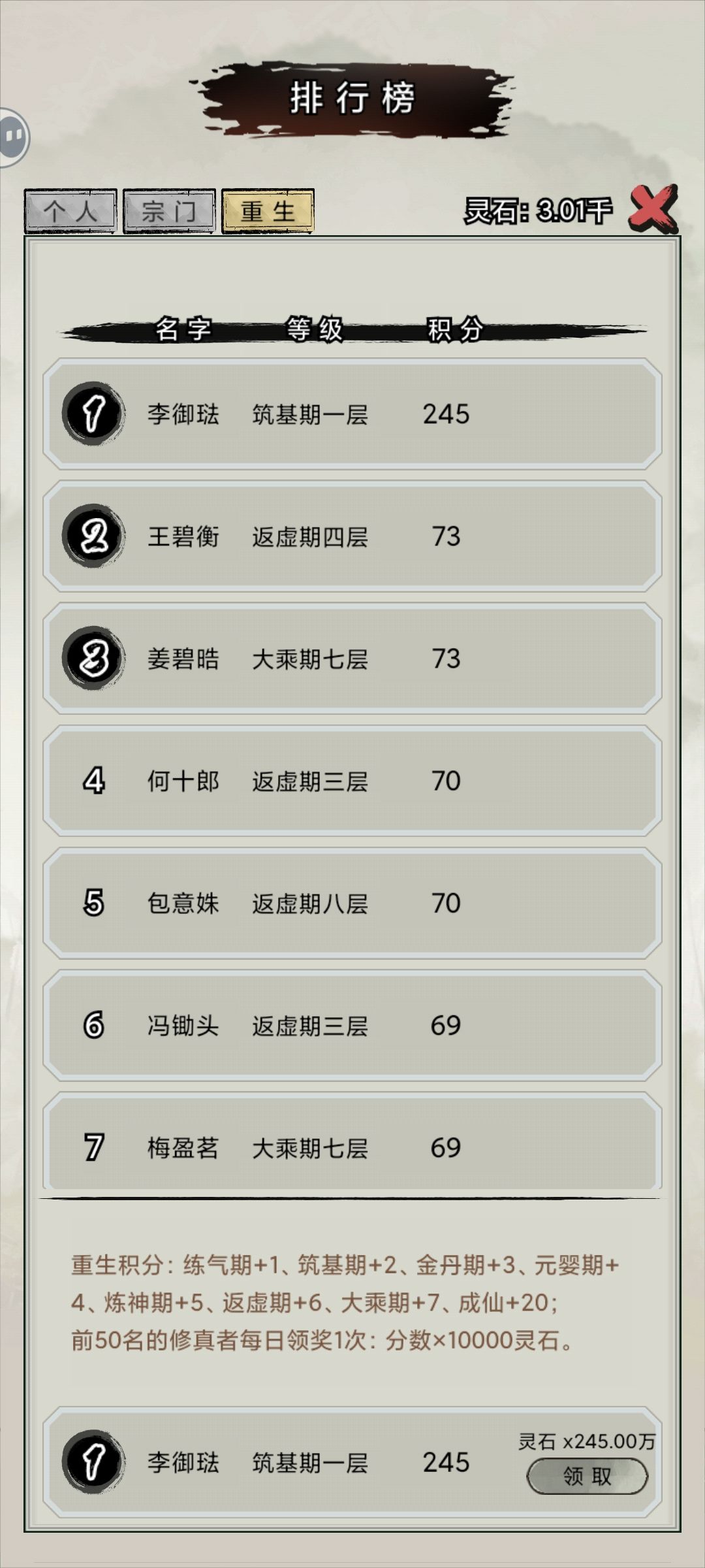 1、飞升 我走的鬼仙路线,首先在女鬼剧情选择放她走,然后在副本获得百鬼夜行功法。功法10级且境界达到大乘期,寿命耗尽生效。鬼仙之后寿命变成9999,战力低的可以在这个阶段疯狂堆。 2、传承 游戏设定的传承和平常的不太一样,也可以理解为成就。 目前我一共获得了两个传承,不打算刷了,条件未知不好搞。 第一个成就:躺枪 天赋全点根骨和悟性,气运和家世都别点,选择天赋也注意不要点到,然后概率会刷到,一岁出