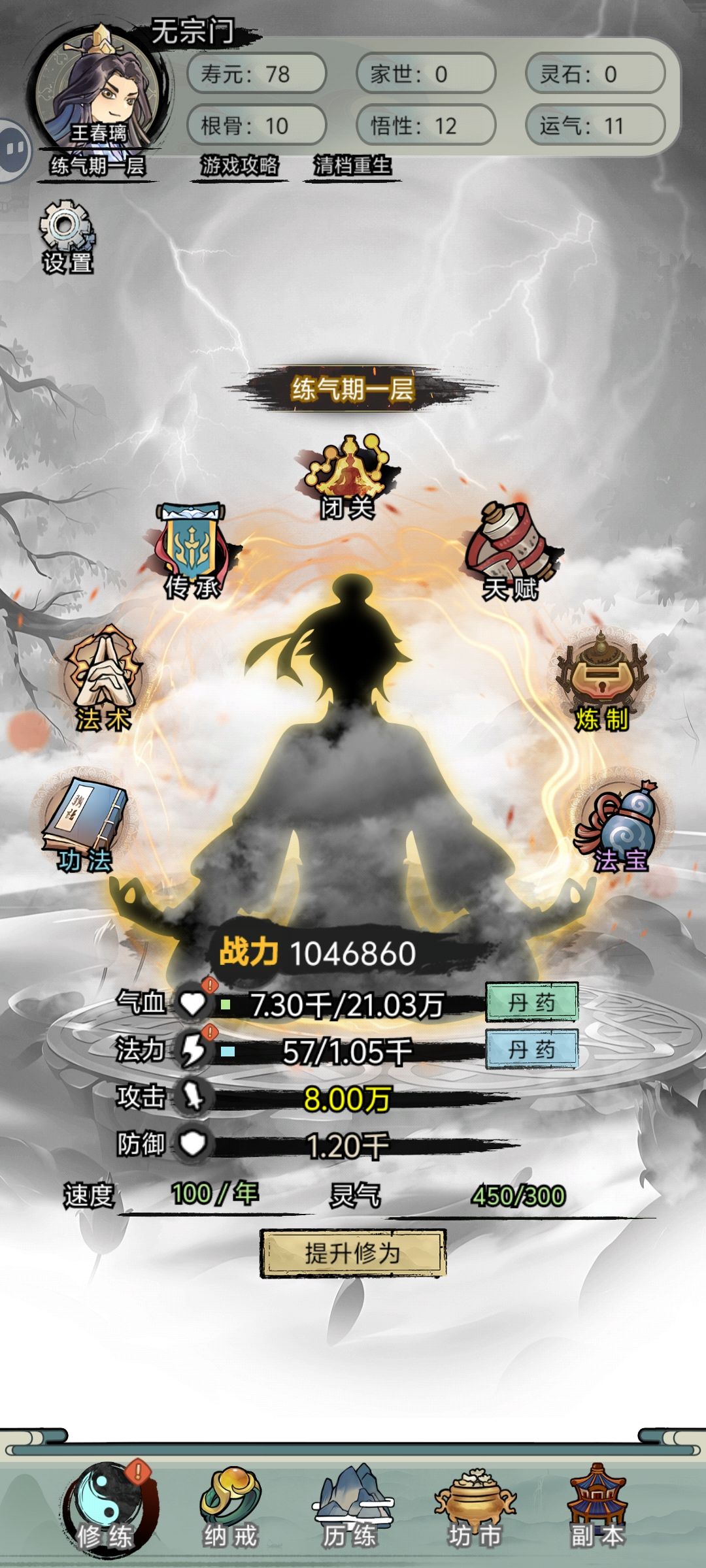 0.0飞升了两次,这边写下攻略记录,让比较困惑的道友能够玩的轻松一些吧,当然我的未必是最优解,有不同看法可以一起讨论的。 关于开局属性天赋 根骨,悟性,家世,气运,这里面4个个人觉得气运是最重要的,其次家世,因为气运太低…容易夭折(别问我怎么知道的),而且在这个版本里面,气运跟家世是没有办法嗑丹药弥补的,根骨和悟性都是可以吃丹药补回来,而且随随便便就能上百,所以开局就算点满10点也是杯水车薪。 所