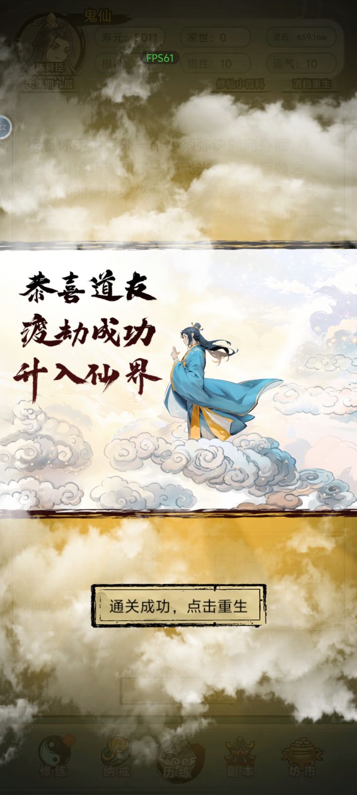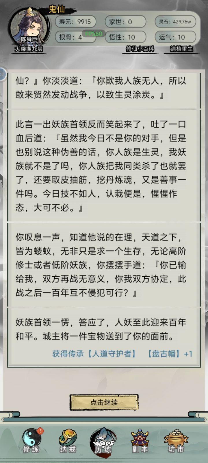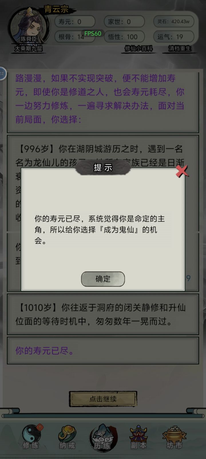 稀里糊涂就拿到一个百鬼夜行功法大乘之后百鬼夜行十级以上死了就可以变鬼仙寿命变成一万年就有大把时间可以叠属性然后一直去升仙令和升仙大劫里面,升仙大劫门亮了等待然后战术冲门就进去了