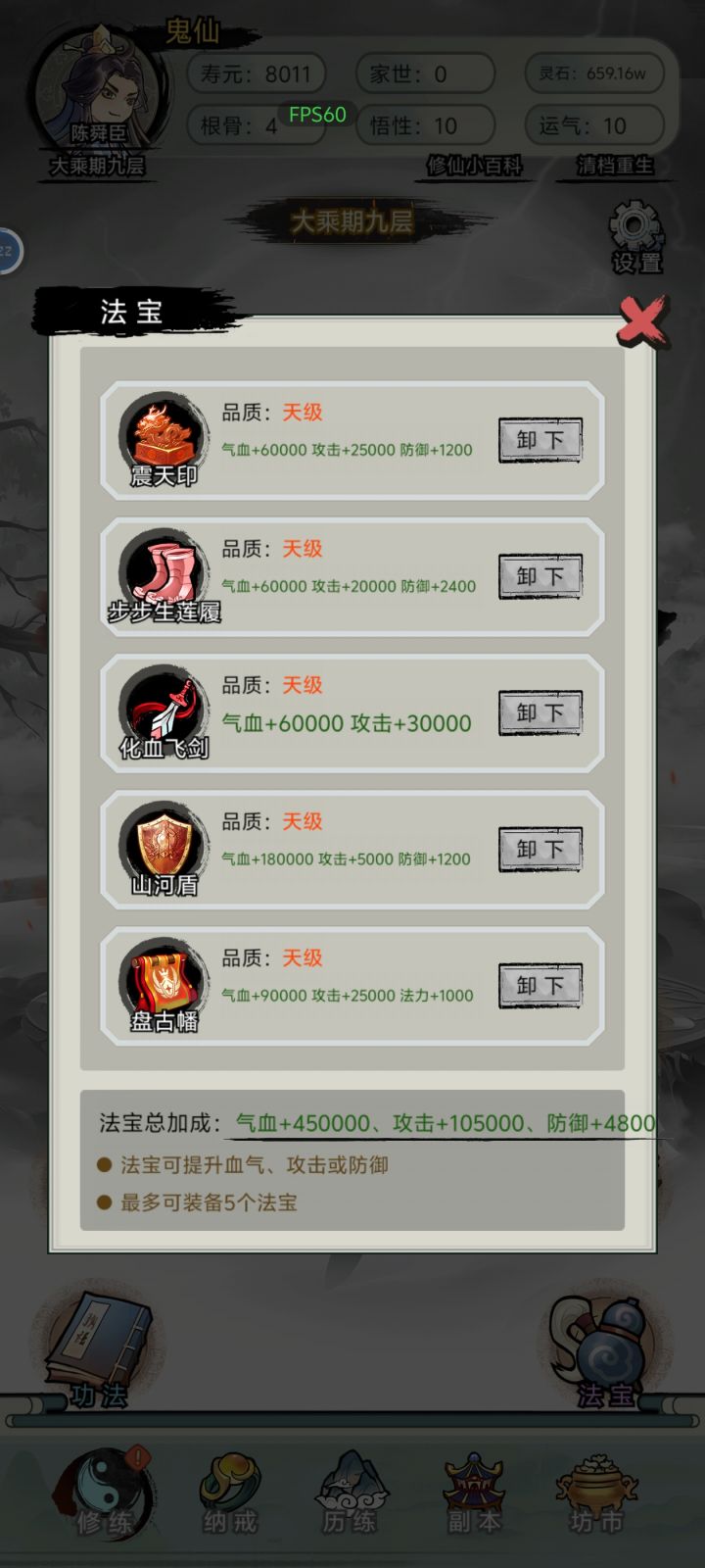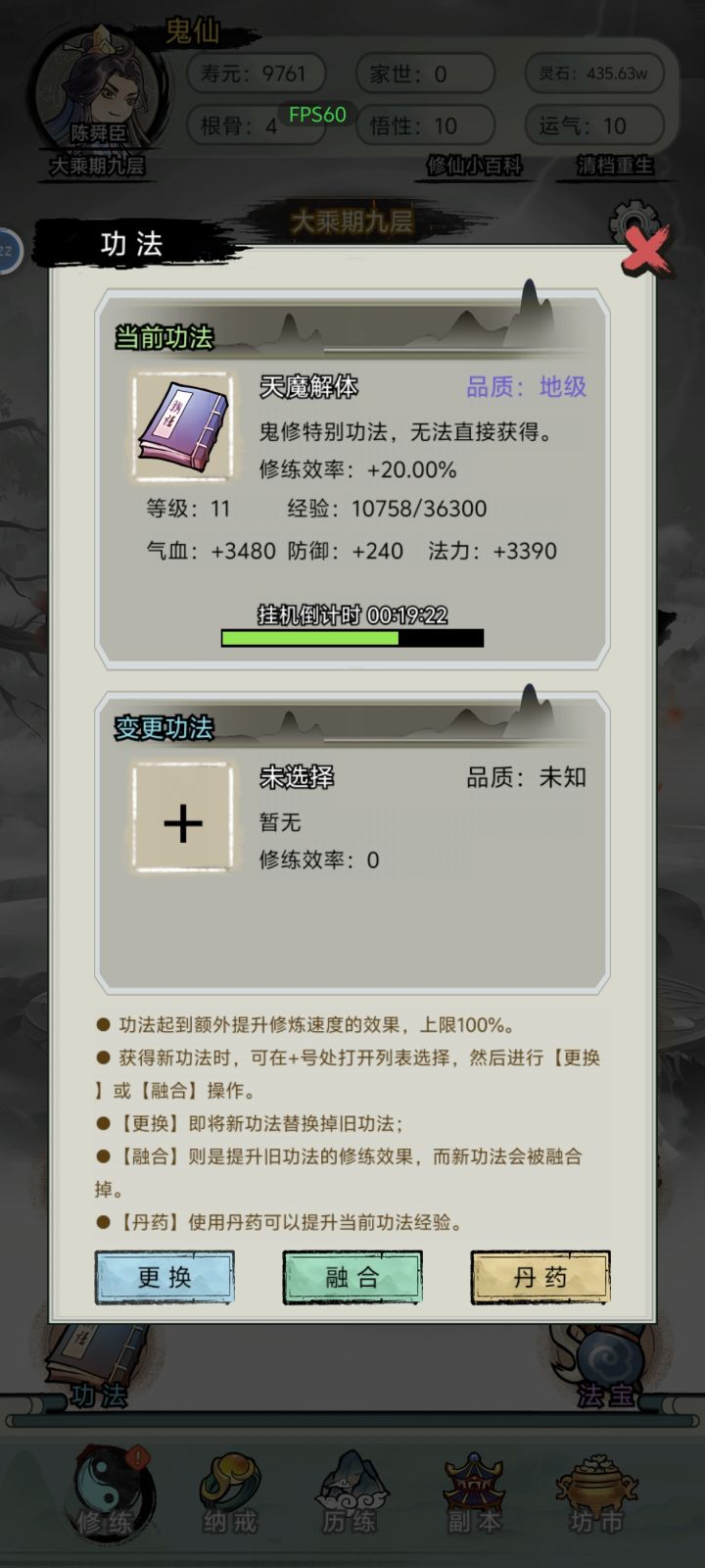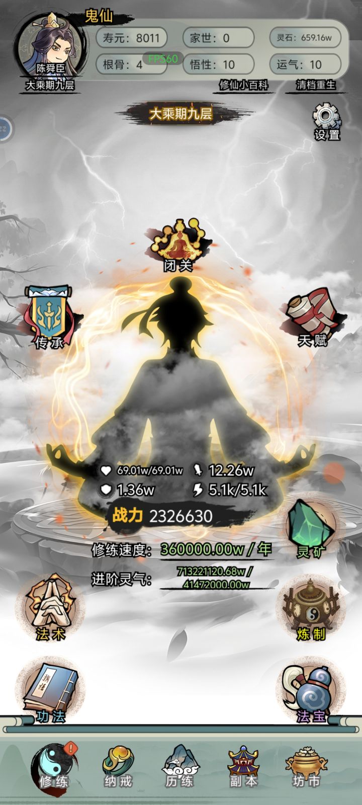 稀里糊涂就拿到一个百鬼夜行功法大乘之后百鬼夜行十级以上死了就可以变鬼仙寿命变成一万年就有大把时间可以叠属性然后一直去升仙令和升仙大劫里面,升仙大劫门亮了等待然后战术冲门就进去了