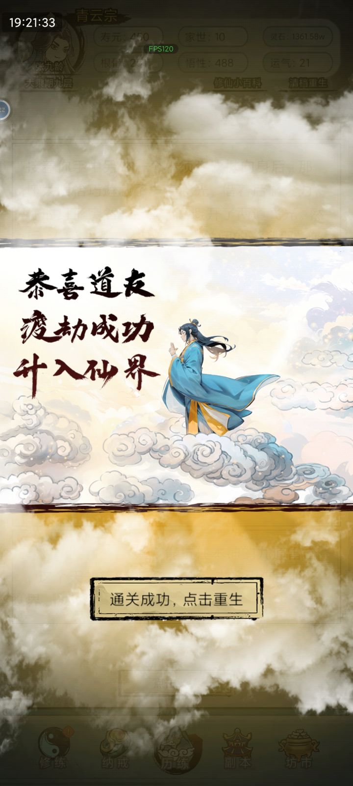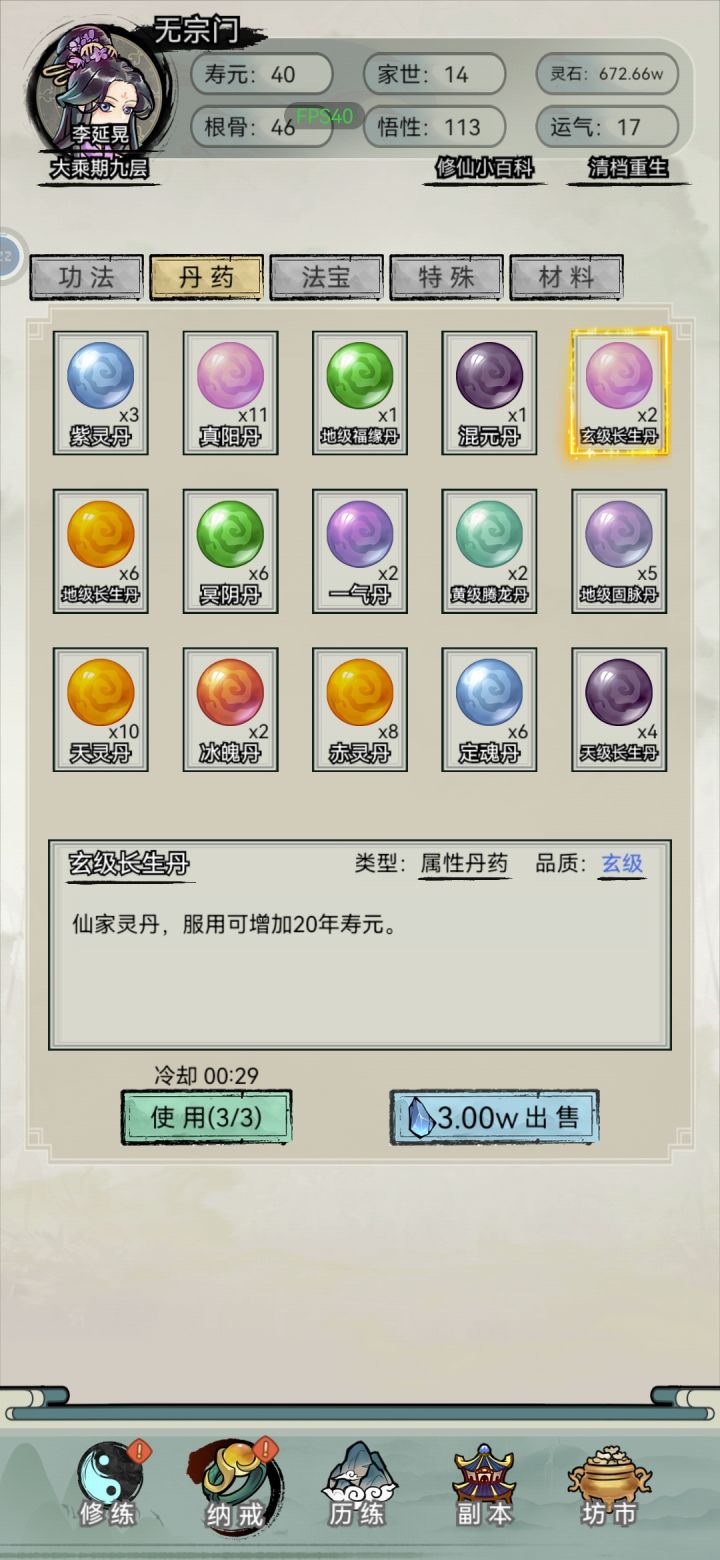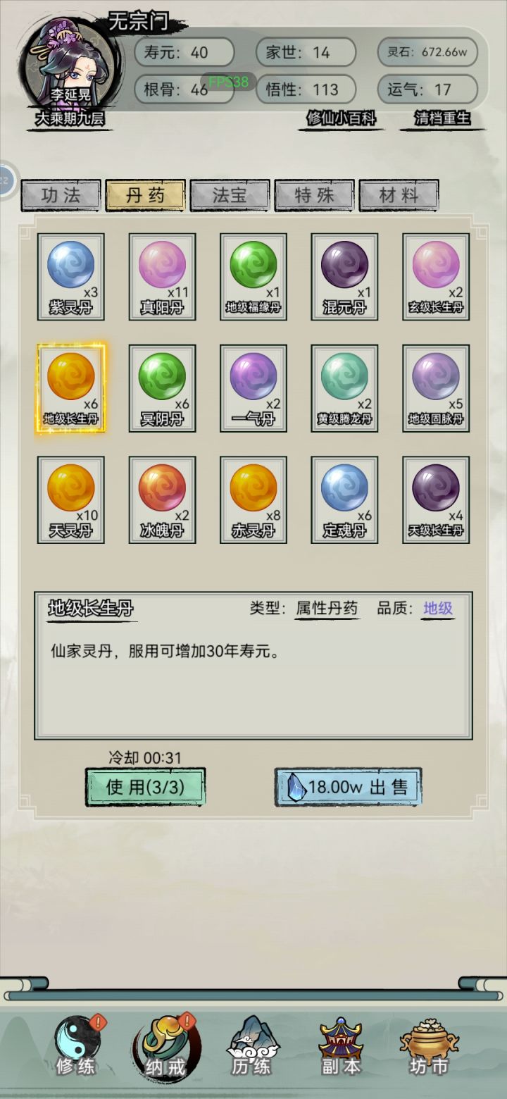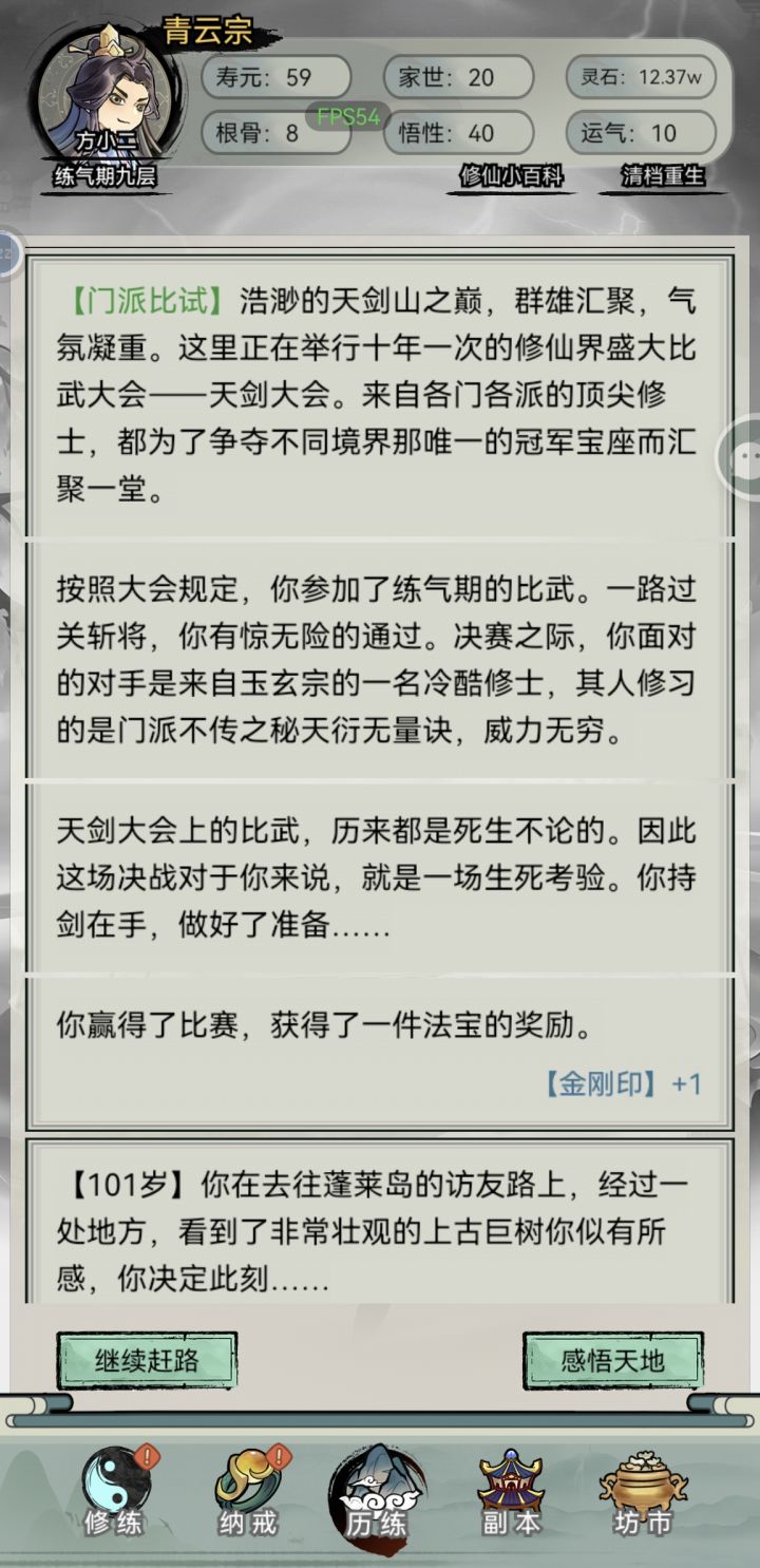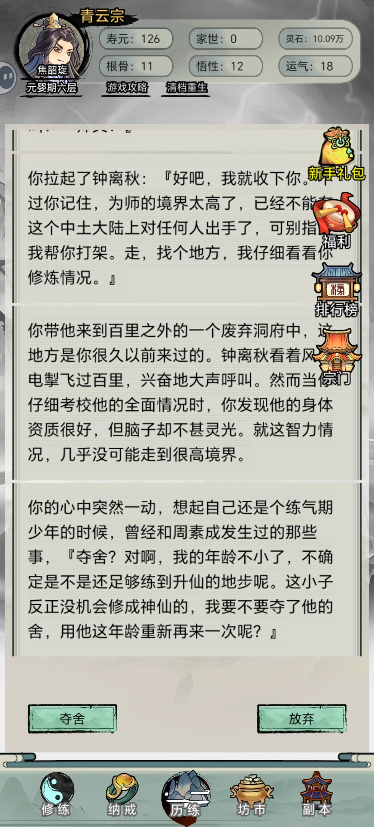 1.开局7点世家(前中期可以白嫖家族物质,用不上的还能卖钱),剩下平均分配即可,天赋尽量选加悟性运气的,悟性高了破阶不用吃药,悟性不够用寿元炼丹,前期千万别浪费钱买破阶丹。2.选项奖励的真气丹通通卖掉,买属性丹药,前期钱少就优先悟性-根骨-运气-属性,后期不缺钱了全买,无脑氪药。特别是采集任务后面给的一气丹一个1200w。3.功法拿到第一本地级就可以开始连续融合了,融到100封顶,后面天级也是