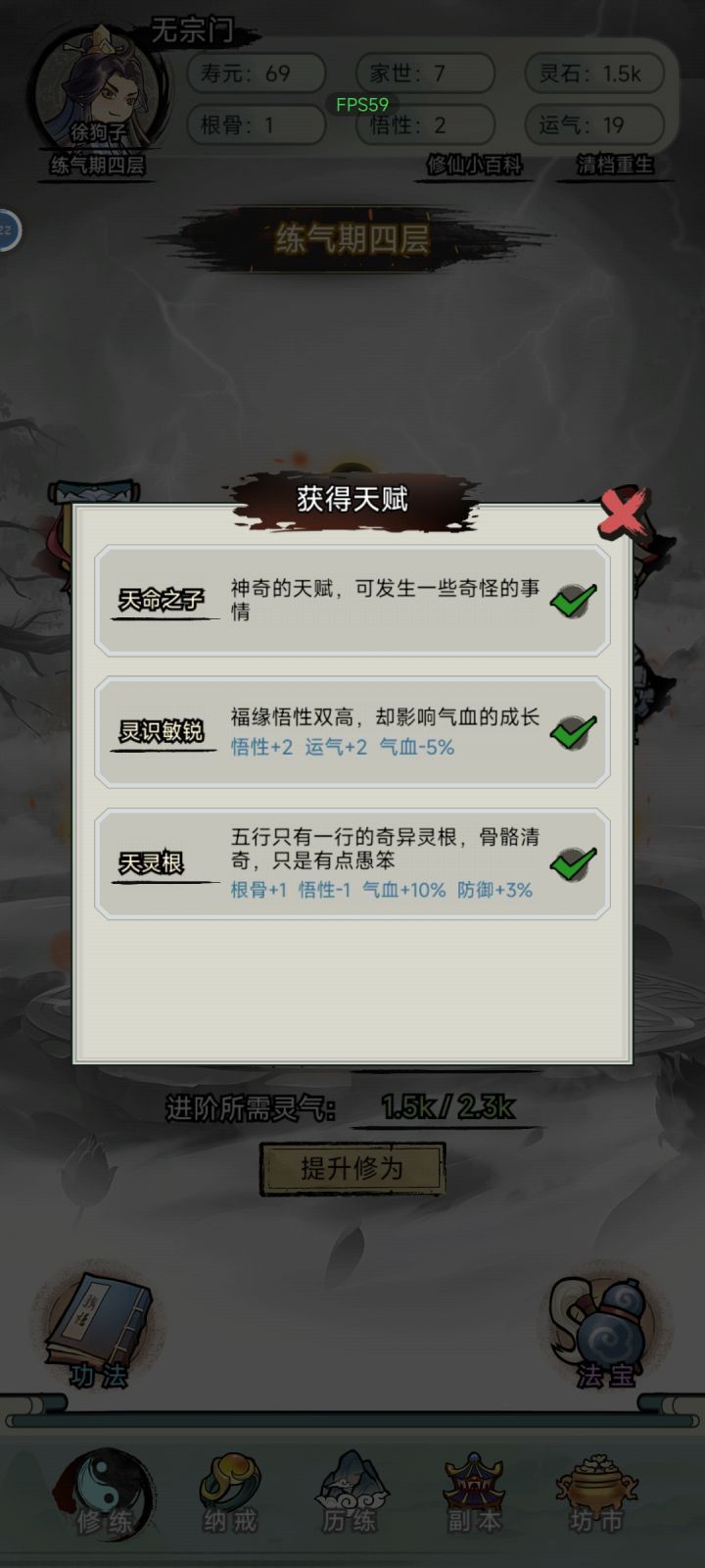 0.0飞升了两次,这边写下攻略记录,让比较困惑的道友能够玩的轻松一些吧,当然我的未必是最优解,有不同看法可以一起讨论的。关于开局属性天赋根骨,悟性,家世,气运,这里面4个个人觉得气运是最重要的,其次家世,因为气运太低…容易夭折(别问我怎么知道的),而且在这个版本里面,气运跟家世是没有办法嗑丹药弥补的,根骨和悟性都是可以吃丹药补回来,而且随随便便就能上百,所以开局就算点满10点也是杯水车薪。所