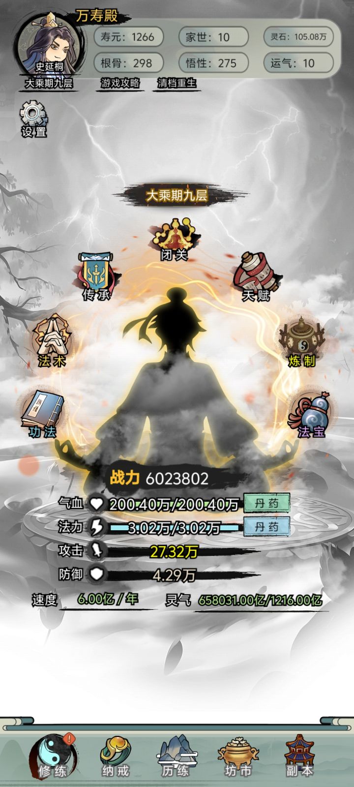 满级是大乘期9级,猜测满级后通过不周山可以成仙,但是不周山只能在化墟期遇见,无法通过磕药实现卡化墟期升仙。开局根骨最重要,建议8左右,其次是家世,家世4是中级家族,7是富有。运气点个4差不多了。一、开局:富有家庭:抓阄的时候选抓笔。不要入门派,入了就没有家庭补贴。这个家庭过得最幸福,当个散修就行。中等家庭随意入不入门派。乞丐必须入,乞丐前期选哼,和八宝粥。二、长大后(一)门派分支:让