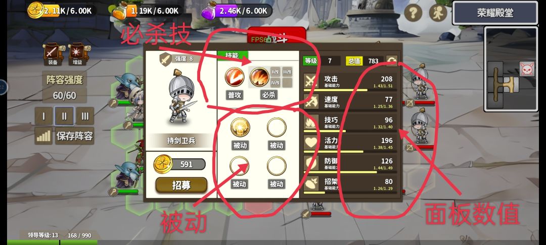 简单讲解一下这套强势阵容: 前排:木乃伊(唯一可双无敌的随从,融魂一个持剑卫兵的开场无敌被动 如上图)一人顶两人(任何前排建议都带个无敌被动) 什么护盾眩晕流都靠边,不如无敌来的实在 中排:本体角色带箭雨(群攻)箭雨装备有套装可加攻(流星火雨也行,不过我喜欢弓箭速度快) ,火女群体火球术(火女的必杀改技一定要四个的毕竟除了加火球数量还加攻)带上祭祀者的被动开场直接放大群体火球,巨像群体激光伤害还带
