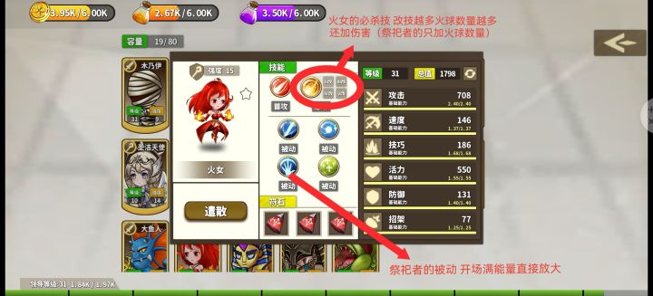 92级的boss对我1级木乃伊一点办法也没有。主要配套如图主角法带火球和回响法杖,最强输出,持续加攻火女,次强输出,持续加攻大嘴花,普技均为aoe,持续加技和速,为主力输出提供养分。魔女,持续给护盾,有效保证2个木乃伊站得住。木乃伊,真神也,不升级也可以硬抗。其中一个满级,一个是1级。区别不大,大大减轻升级压力。