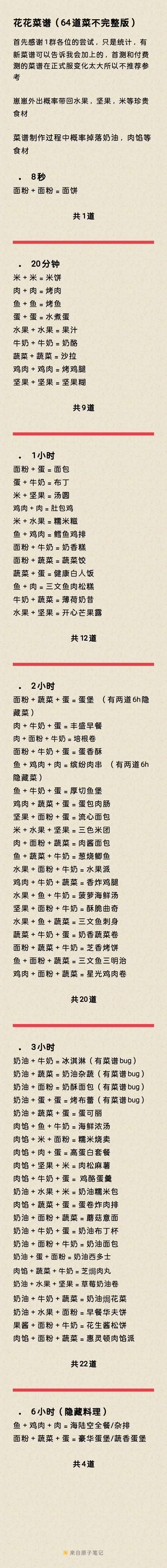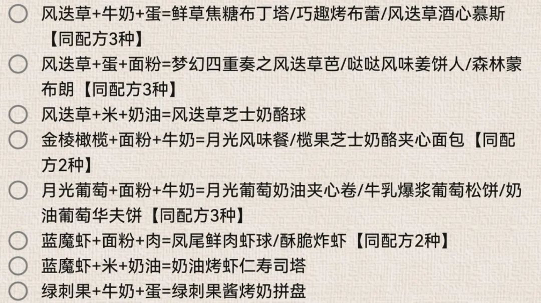 -------------------------------------- 统计:常规菜谱(76/76) 常规菜谱更新(49/49) 隐藏菜谱(15) 隐藏菜谱更新(16/18) 活动菜谱(11) 📌图片版在最后 -------------------------------------- ⏰1小时(图鉴顺序) 风迭草+牛奶=风迭草玻璃奶冻 风迭草+鸡肉=怪奇花香大鸡腿 风迭草+坚果=风
